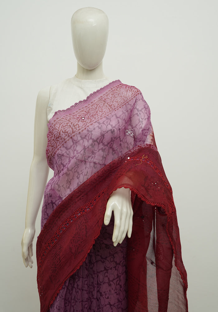 Purple and Red Block printed Supernet Kota Saree With Crochet Work