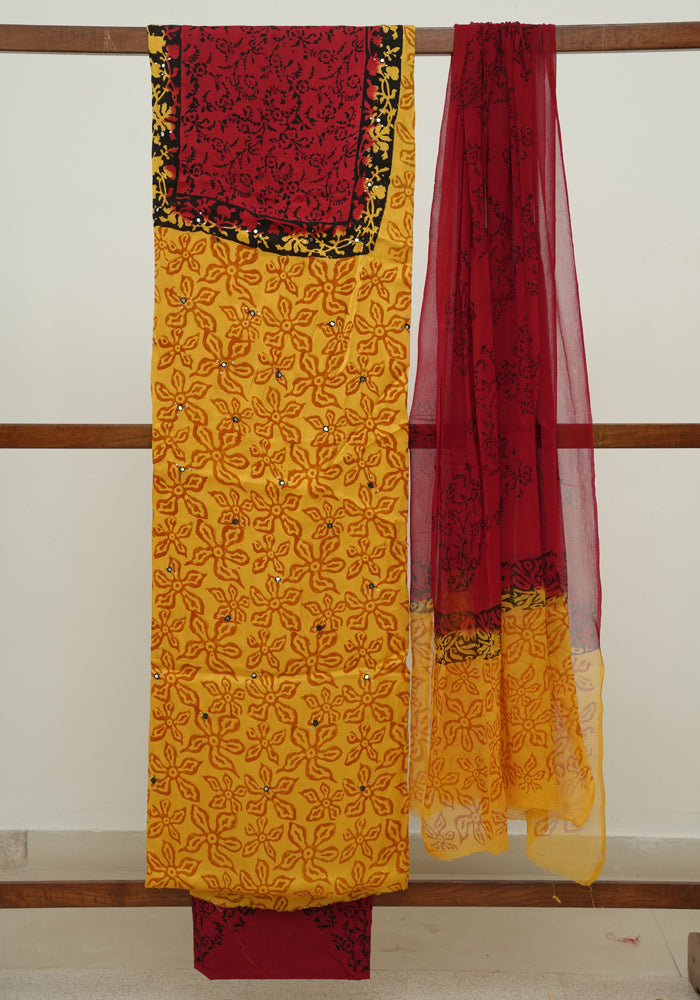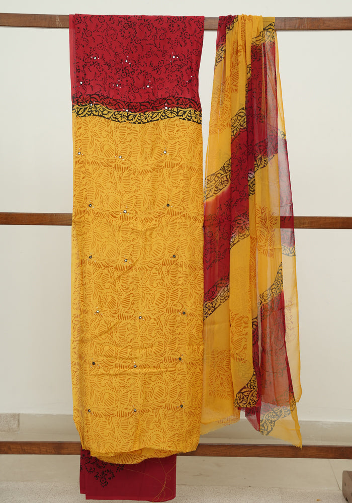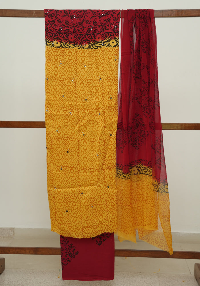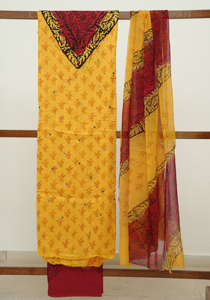 Yellow and Red Modal Silk Block Printed Unstitched Salwar Set With Mirror and Badla Work