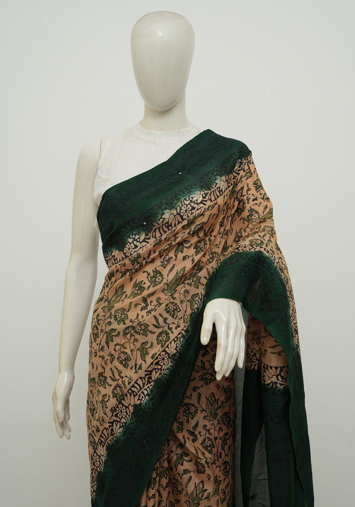Light Brown and Green Block Printed Chennur Silk Saree with Mirror Work