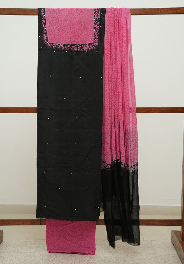 Black and Pink Unstitched Chennur Silk Salwar Set With Mirror Work