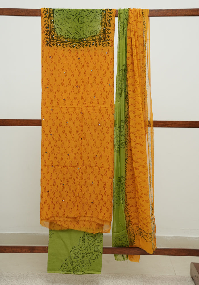 Mango Yellow and Mehandi Green Unstitched Georgette Salwar Set with Mirror Work