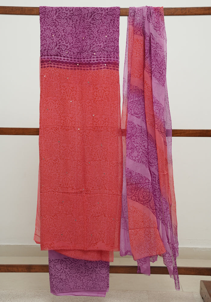 Peach and Purple Unstitched Georgette Salwar Set with Mirror Work