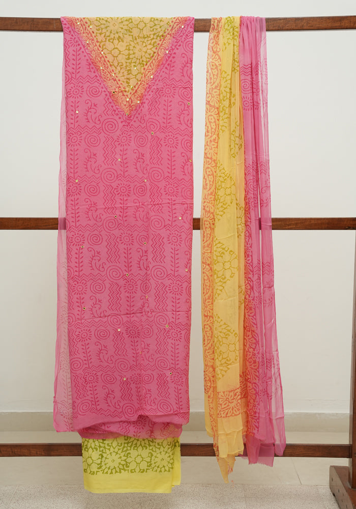 Pink and Red Unstitched Georgette Salwar Set with Batik Print