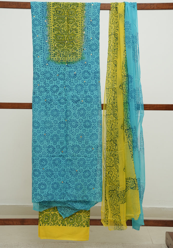 Sky Blue and Blue Unstitched Georgette Salwar Set with Batik Print