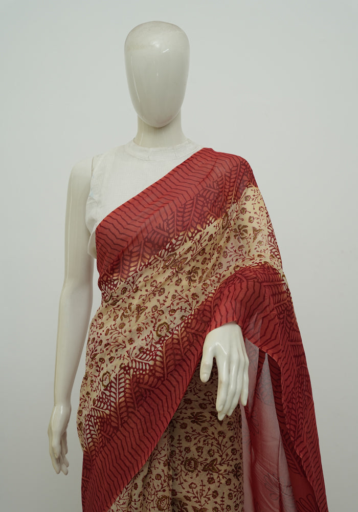 Light Brown and Rust Red Block Printed Georgette Saree