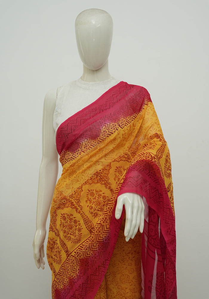Mango Yellow and Pink Block Printed Georgette Saree