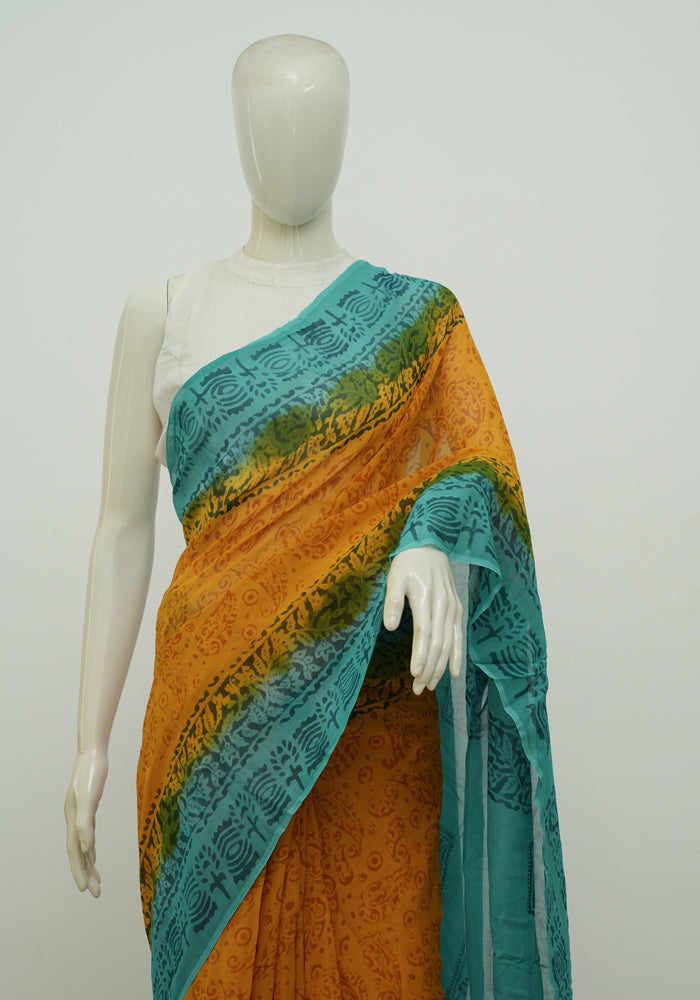 Mango Yellow and Turquoise Blue Block Printed Georgette Saree