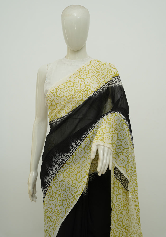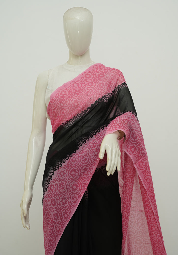 Black and Peach Block Printed Georgette Saree with Badla Work