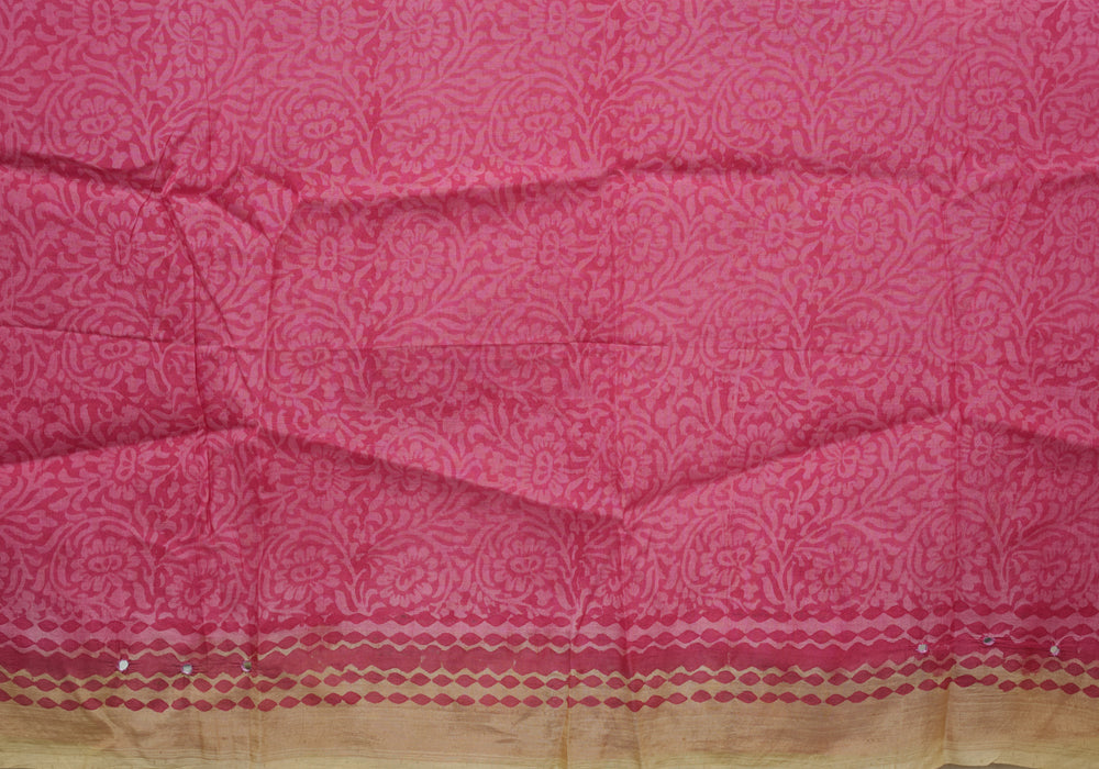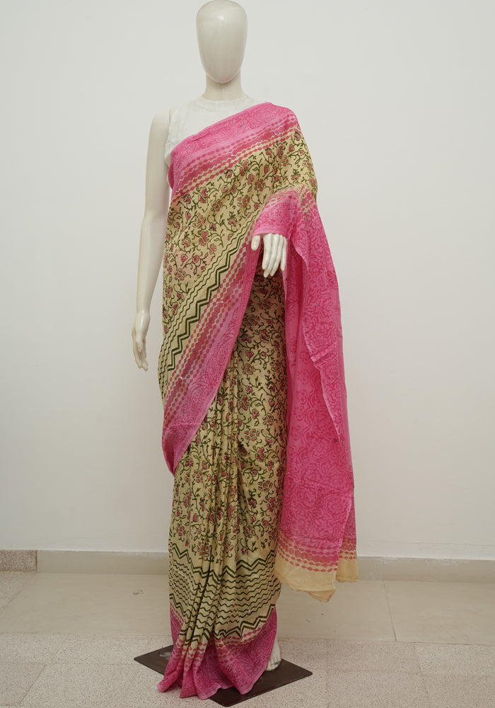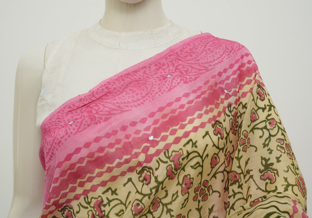 Beige and Pink Block Printed Chennur Silk Saree with Mirror Work is OUT OF STOCK currently and available on pre-payment only. Order now for delivery within 2 weeks.