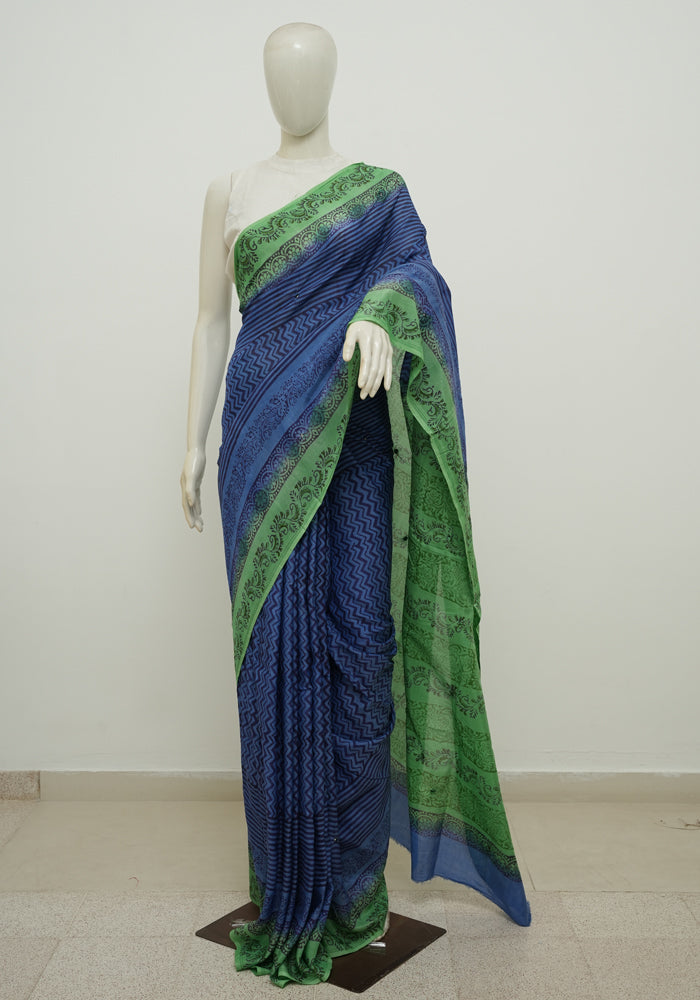 Blue and Parrot Green Block Printed Chennur Silk Saree with Mirror Work