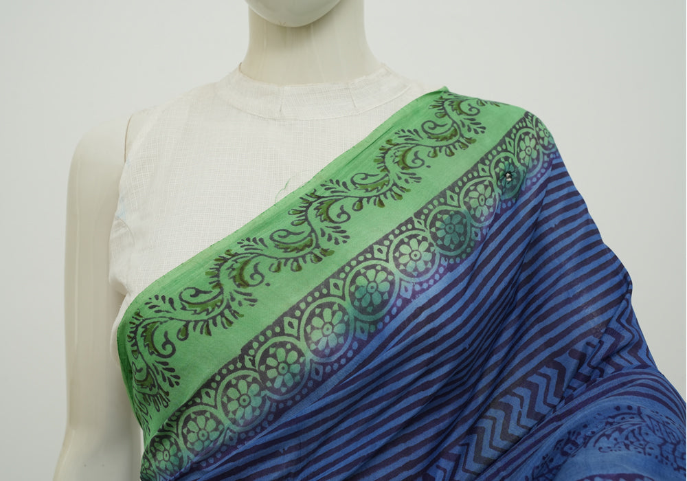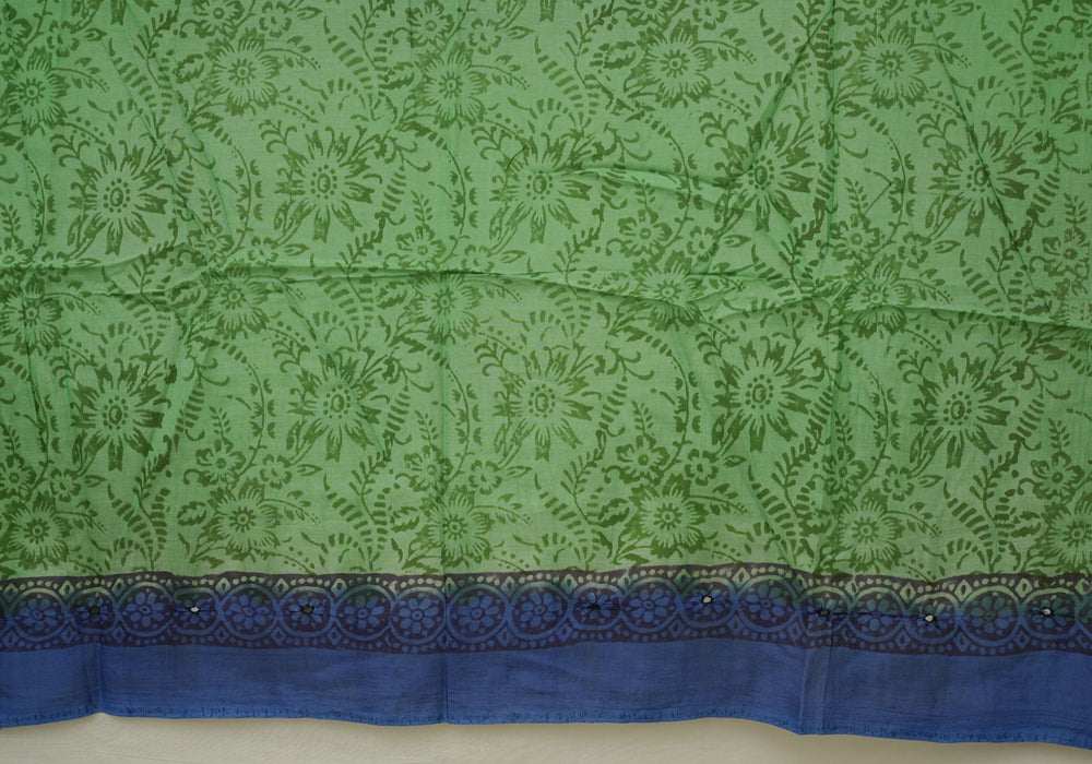 Blue and Parrot Green Block Printed Chennur Silk Saree with Mirror Work is OUT OF STOCK currently and available on pre-payment only. Order now for delivery within 2 weeks.