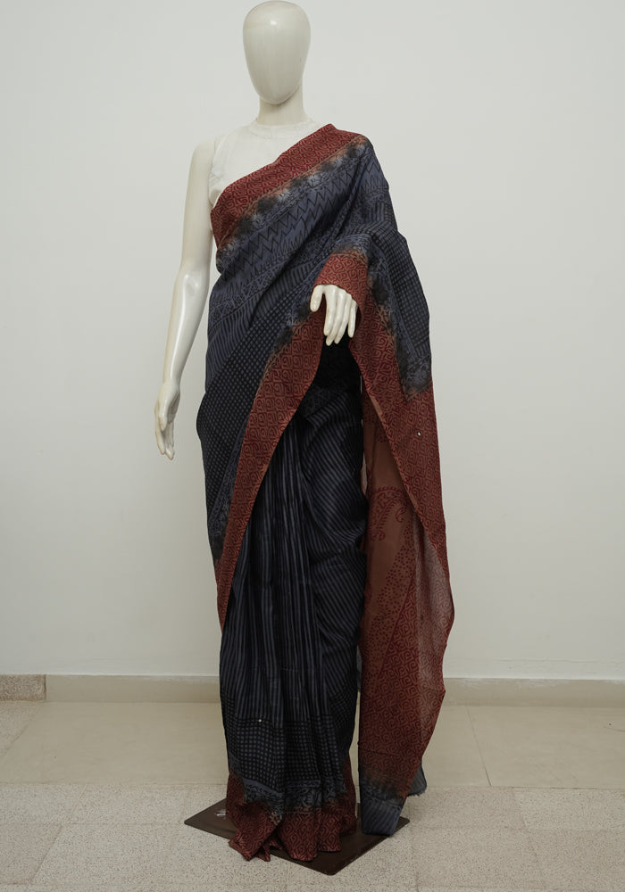 Grey and Brown Block Printed Chennur Silk Saree with Mirror Work