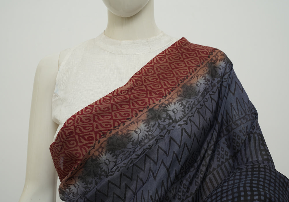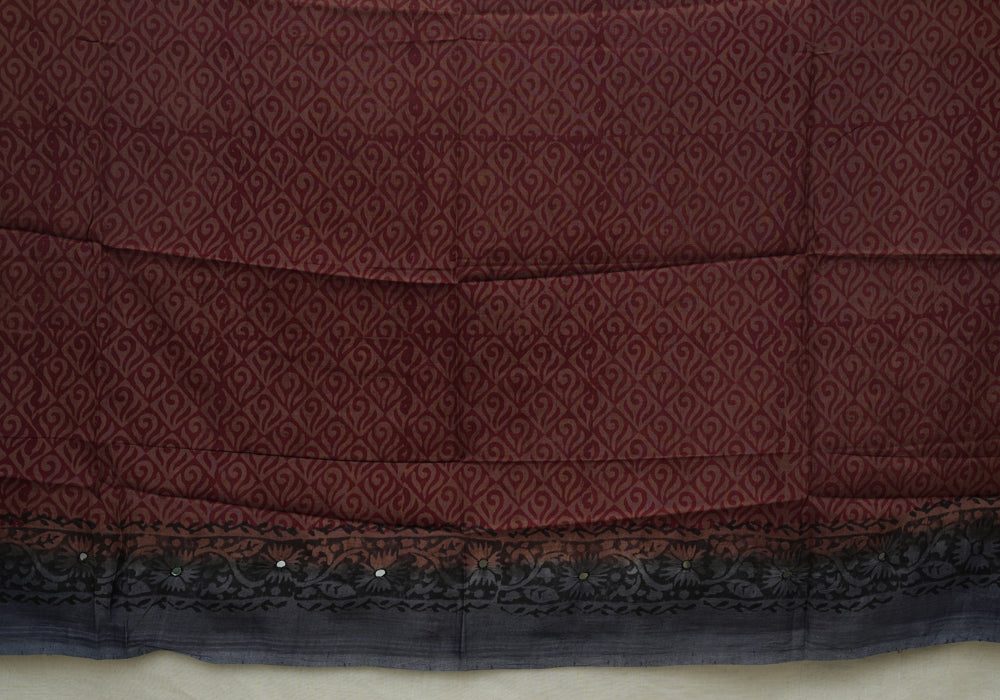 Grey and Brown Block Printed Chennur Silk Saree with Mirror Work is OUT OF STOCK currently and available on pre-payment only. Order now for delivery within 2 weeks.