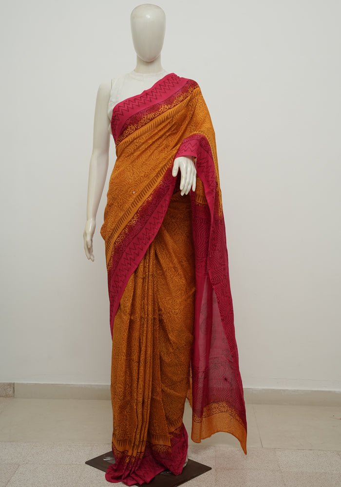 Mustard Yellow and Red Block Printed Chennur Silk Saree with Mirror Work