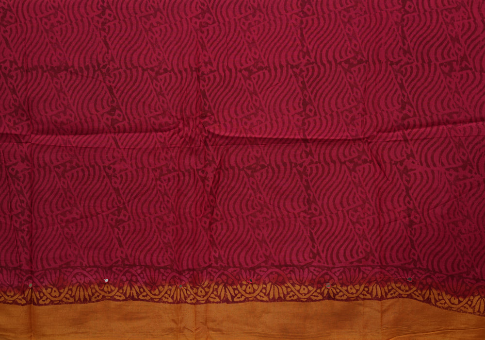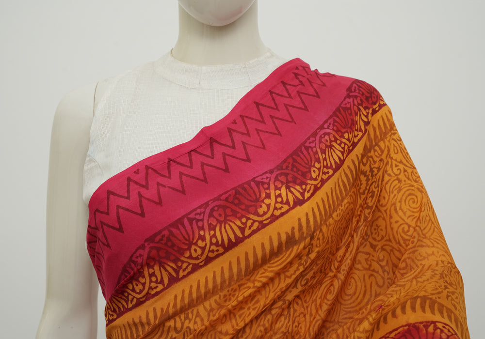 Mustard Yellow and Red Block Printed Chennur Silk Saree with Mirror Work is OUT OF STOCK currently and available on pre-payment only. Order now for delivery within 2 weeks.