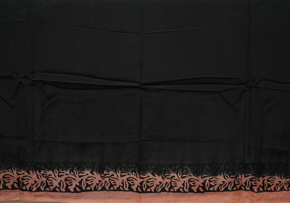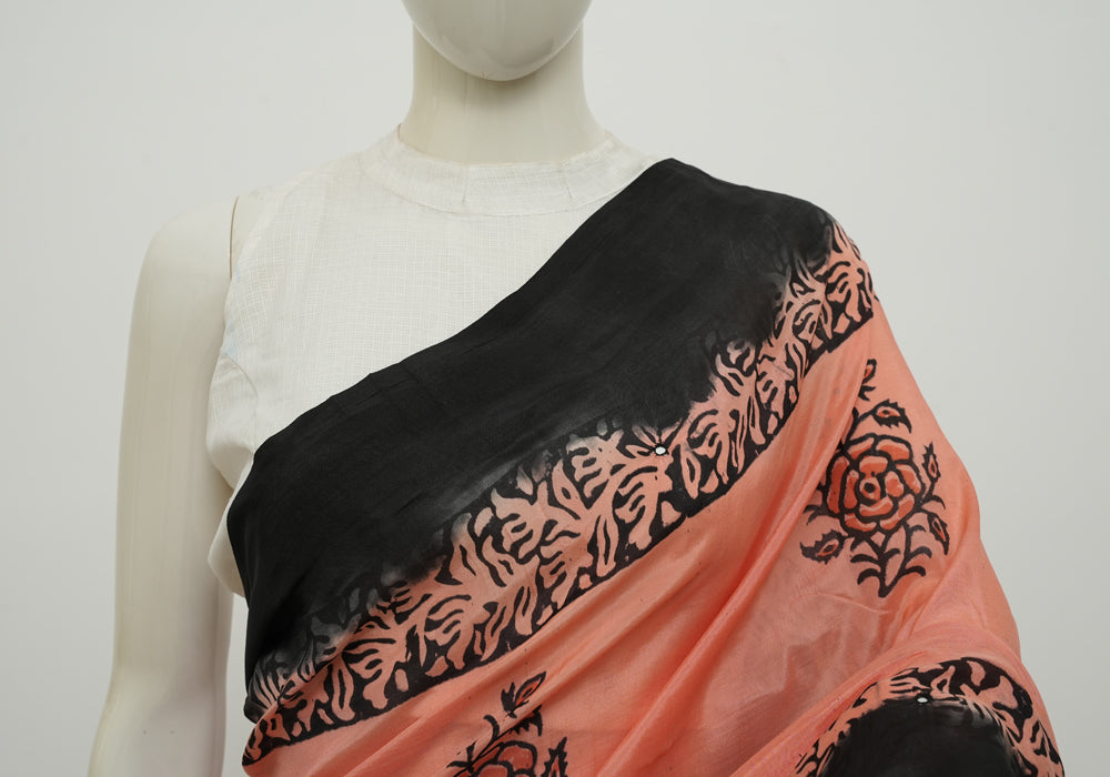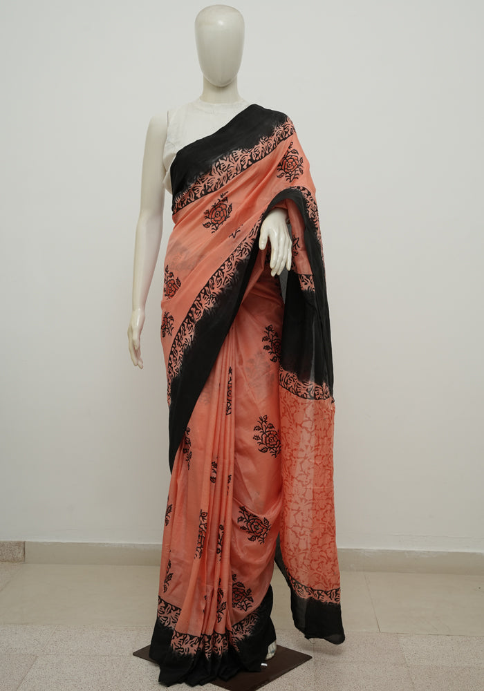 Peach and Black Block Printed Chennur Silk Saree with Mirror Work