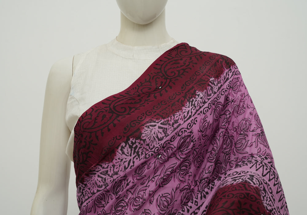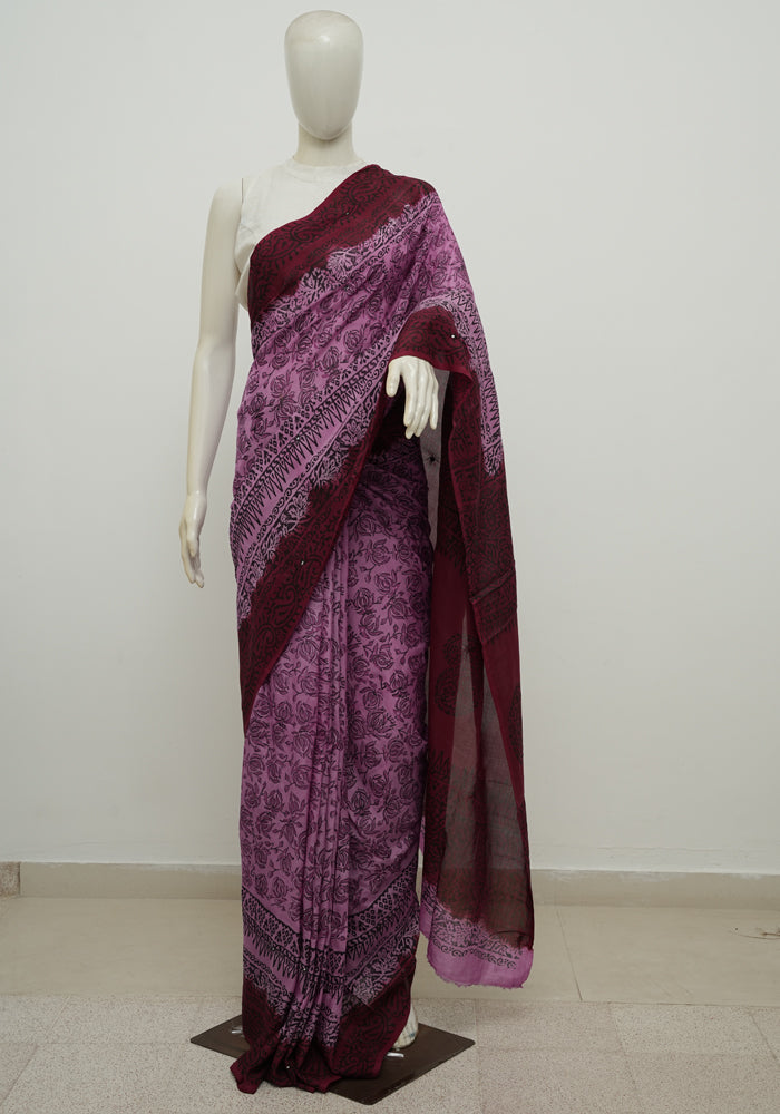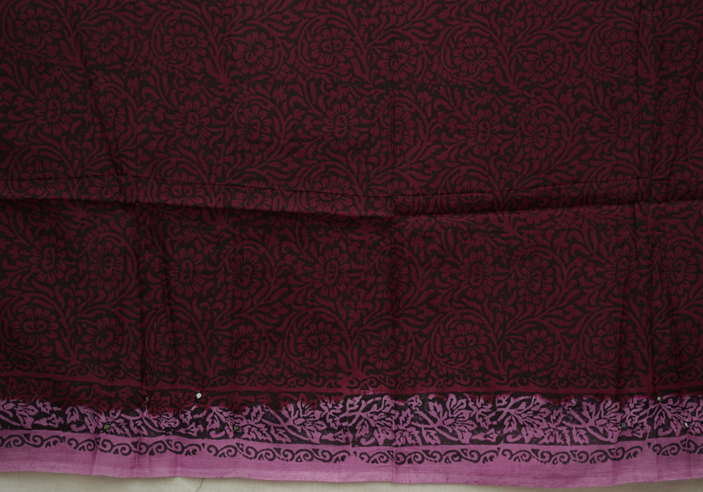 Purple and Jamun Red Block Printed Chennur Silk Saree with Mirror Work is OUT OF STOCK currently and available on pre-payment only. Order now for delivery within 2 weeks.