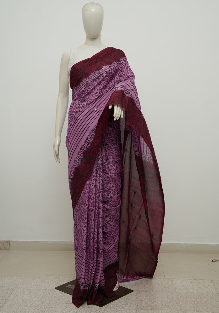 Purple and Jamun Red Block Printed Chennur Silk Saree with Mirror Work