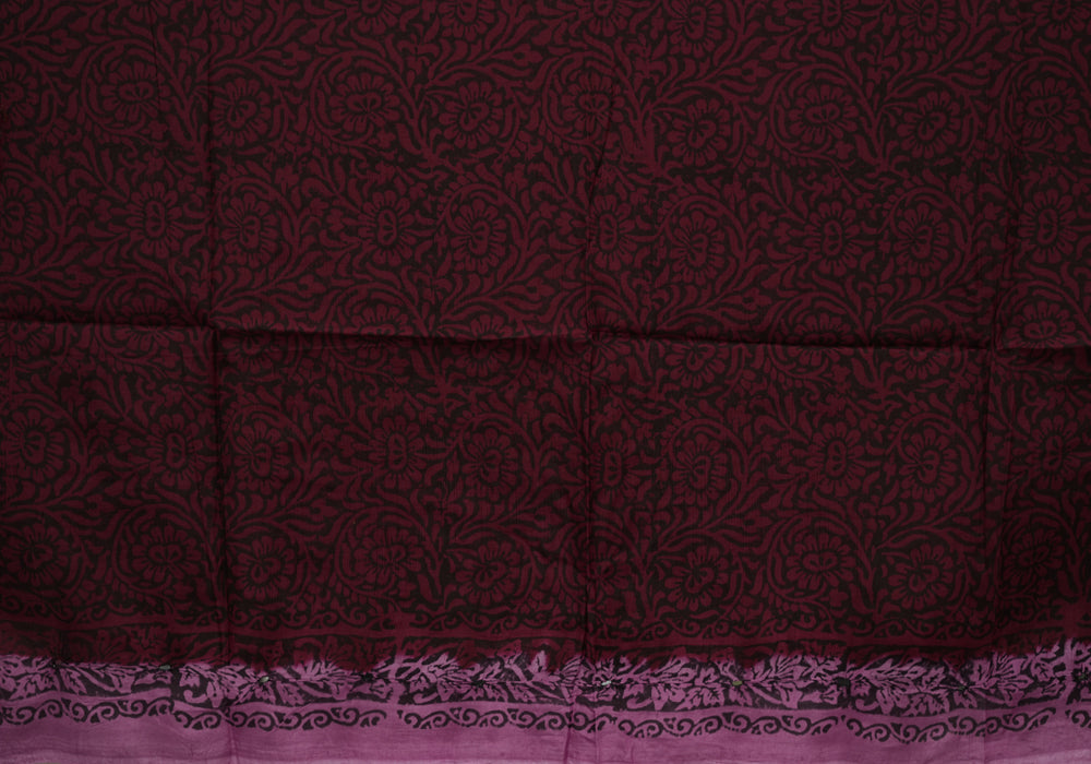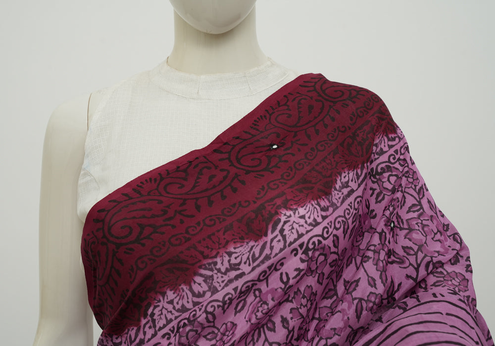 Purple and Jamun Red Block Printed Chennur Silk Saree with Mirror Work is OUT OF STOCK currently and available on pre-payment only. Order now for delivery within 2 weeks.