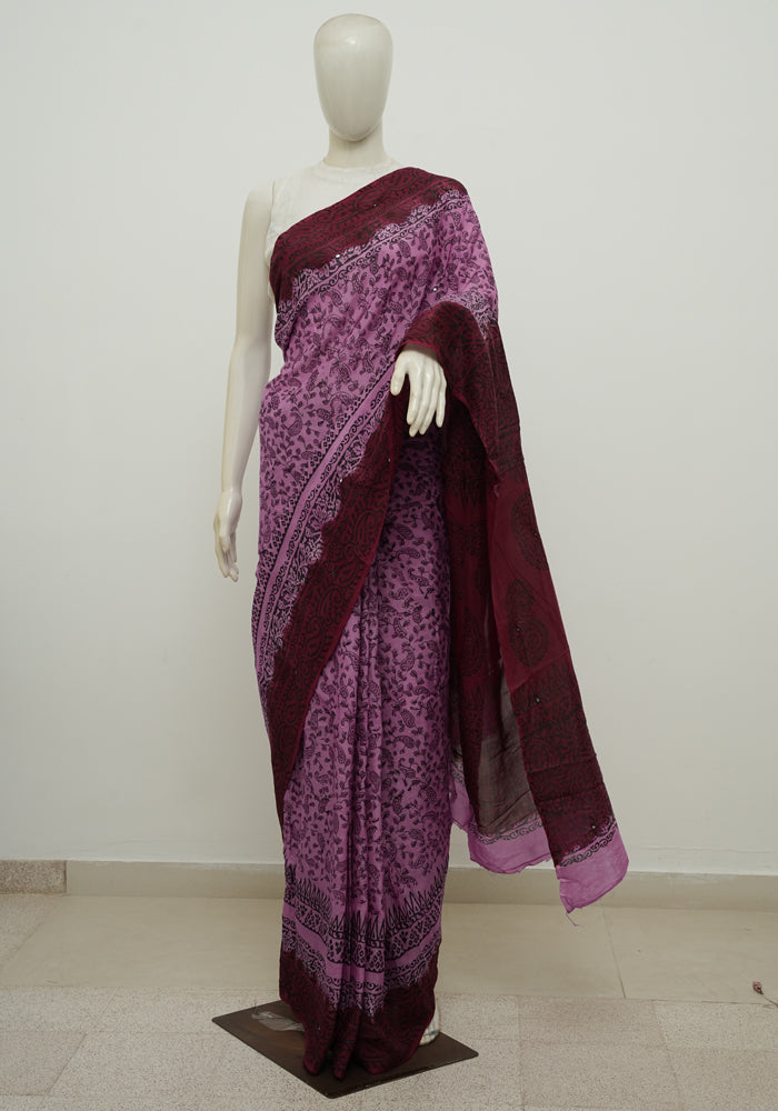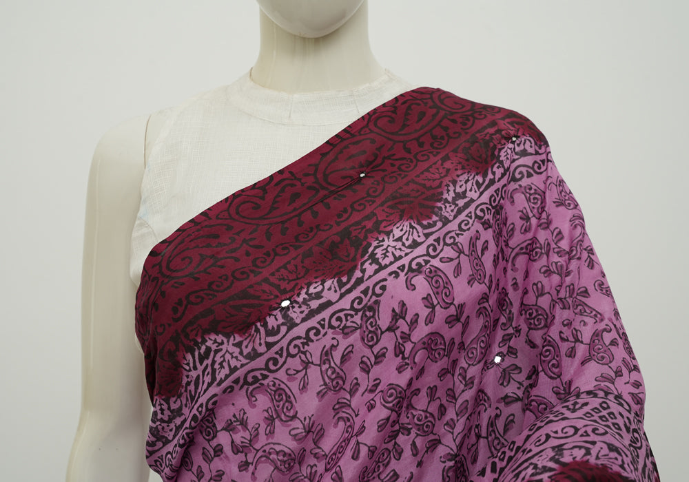 Purple and Red Block Printed Chennur Silk Saree with Mirror Work
