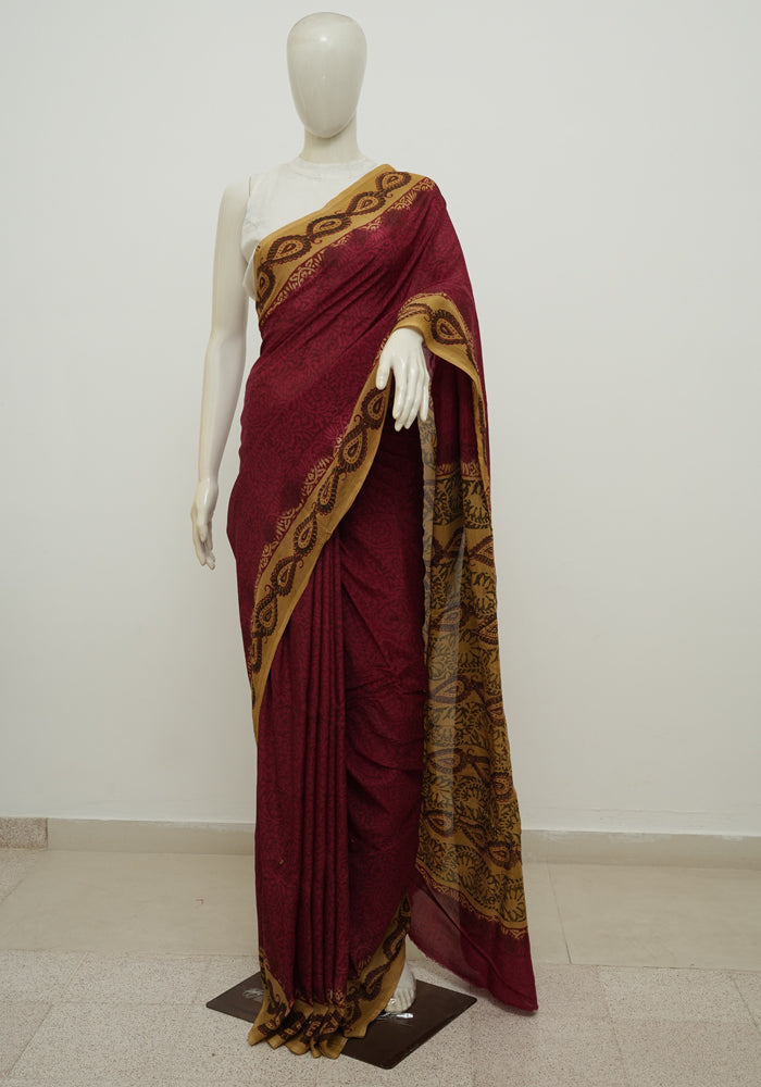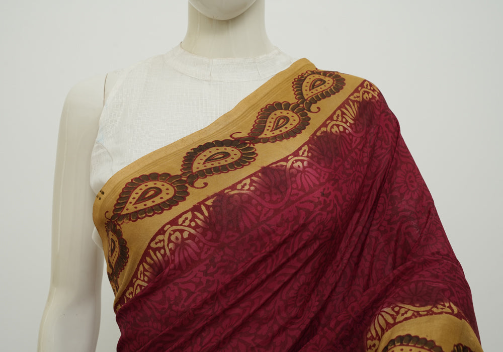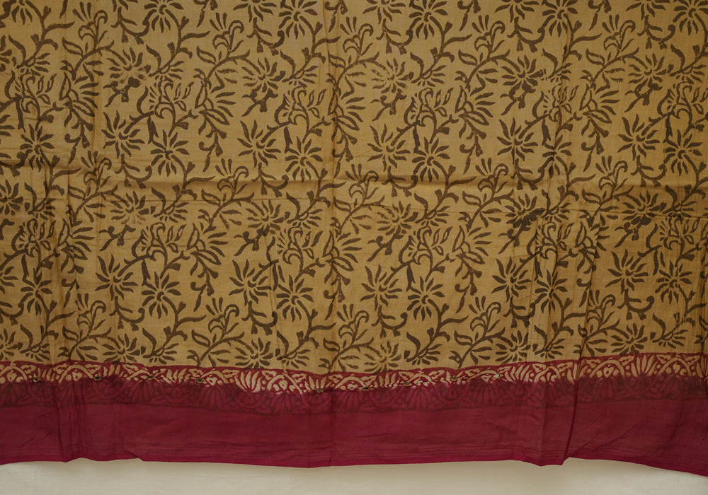 Red and Light Brown Block Printed Chennur Silk Saree with Mirror Work is OUT OF STOCK currently and available on pre-payment only. Order now for delivery within 2 weeks.