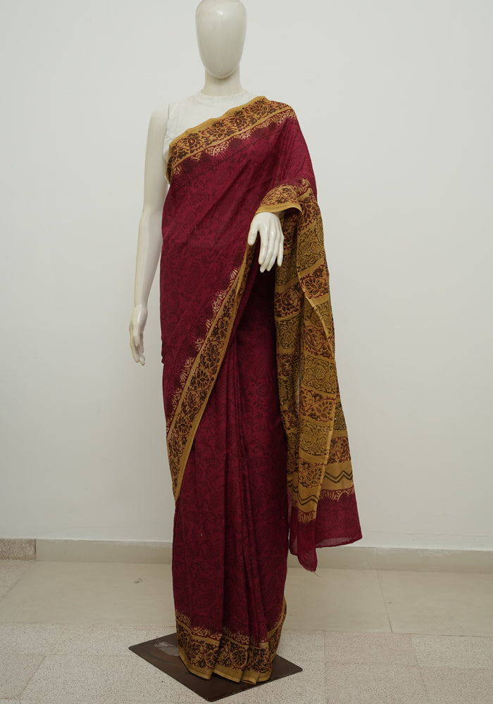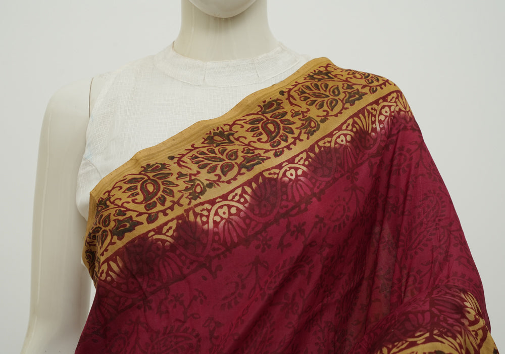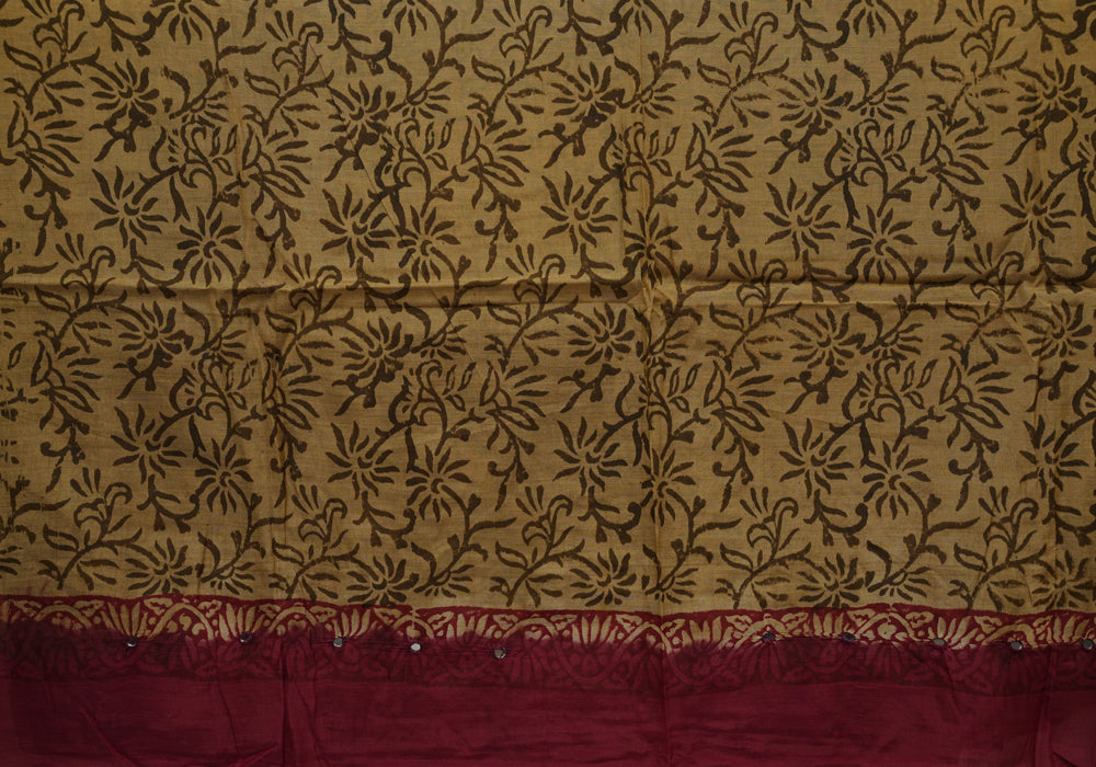 Red and Light Brown Block Printed Chennur Silk Saree with Mirror Work is OUT OF STOCK currently and available on pre-payment only. Order now for delivery within 2 weeks.