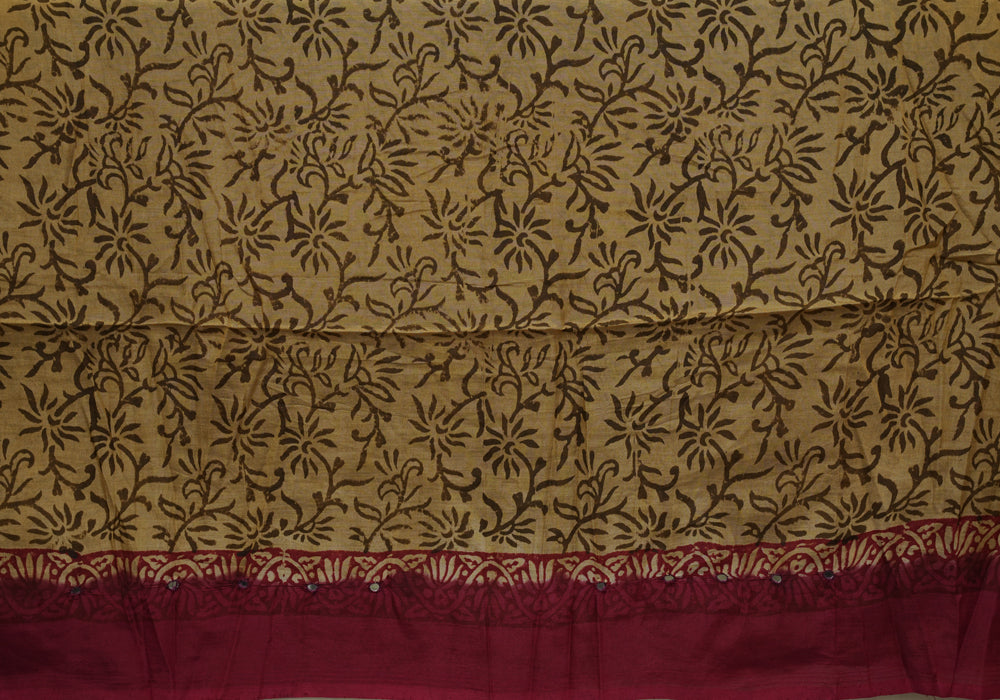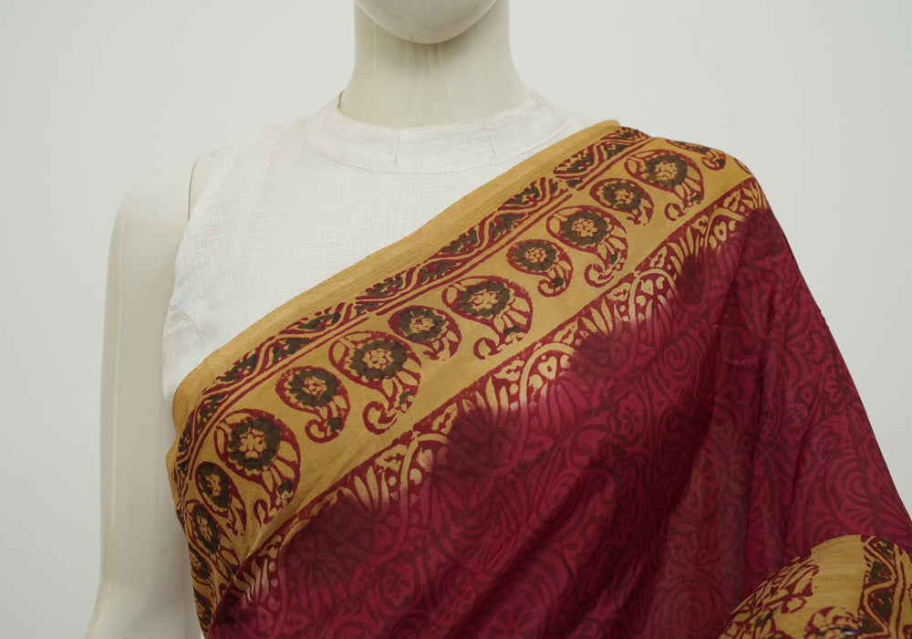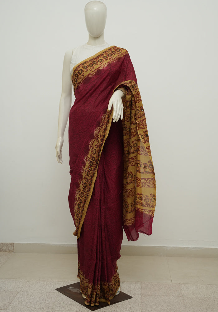 Red and Light Brown Block Printed Chennur Silk Saree with Mirror Work is OUT OF STOCK currently and available on pre-payment only. Order now for delivery within 2 weeks.