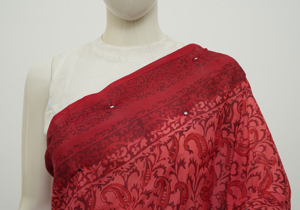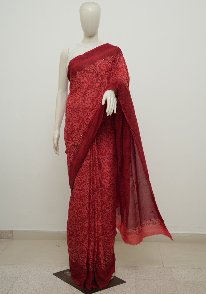 Red Block Printed Chennur Silk Saree with Mirror Work