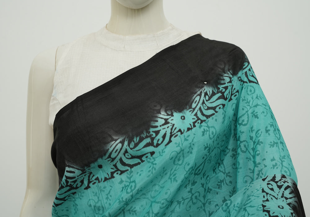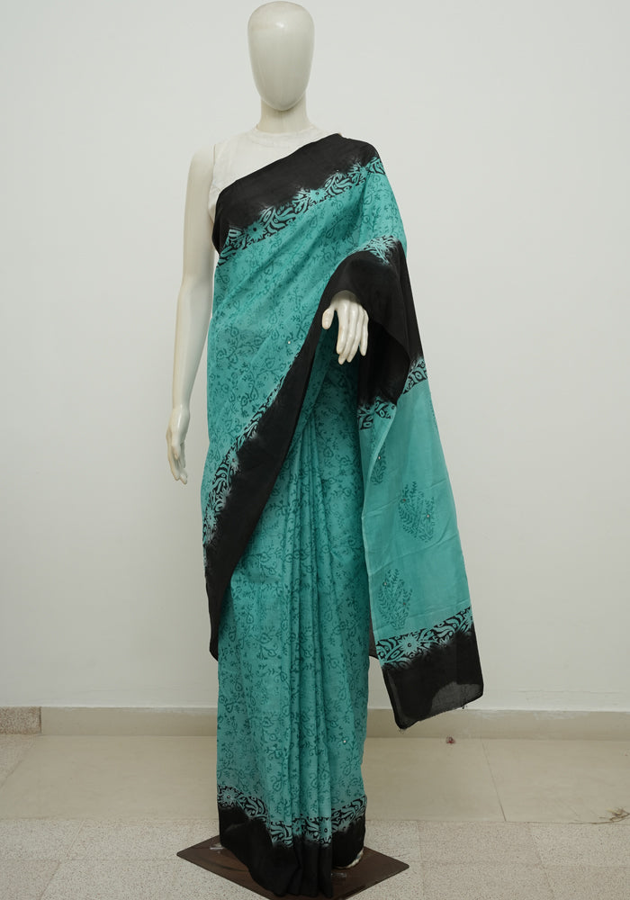 Sea green and Black Block Printed Chennur Silk Saree with Mirror Work
