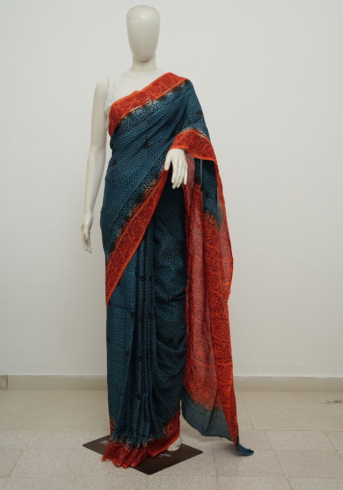 Teal Blue and Orange Block Printed Chennur Silk Saree with Mirror Work