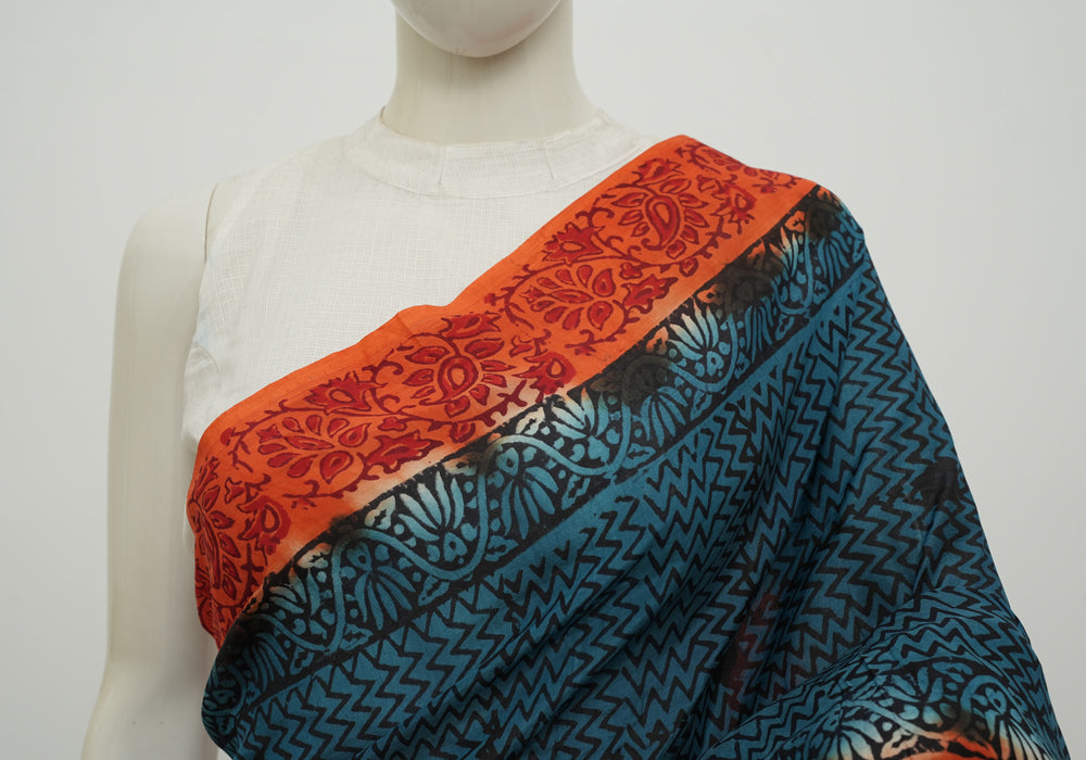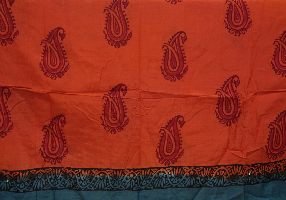 Teal Blue and Orange Block Printed Chennur Silk Saree with Mirror Work is OUT OF STOCK currently and available on pre-payment only. Order now for delivery within 2 weeks.