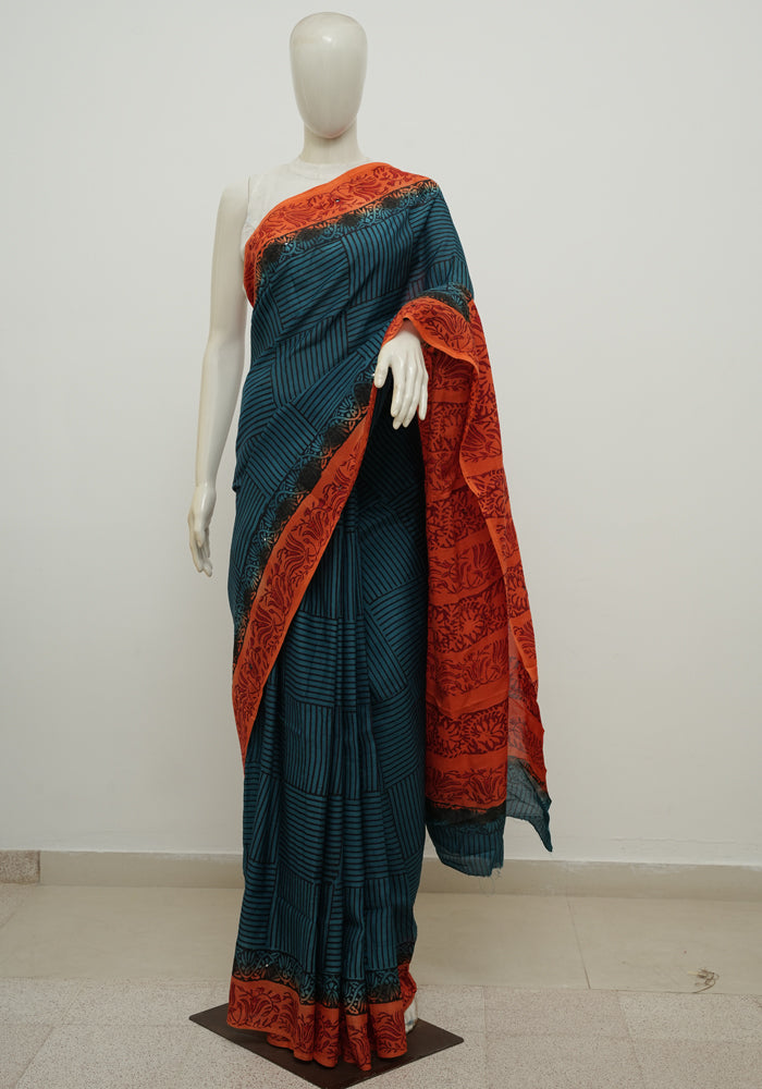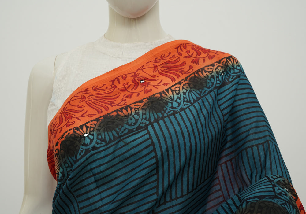 Teal Blue and Orange Block Printed Chennur Silk Saree with Mirror Work