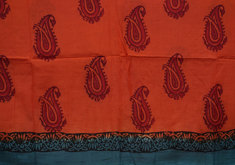 Teal Blue and Orange Block Printed Chennur Silk Saree with Mirror Work is OUT OF STOCK currently and available on pre-payment only. Order now for delivery within 2 weeks.