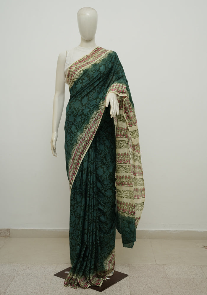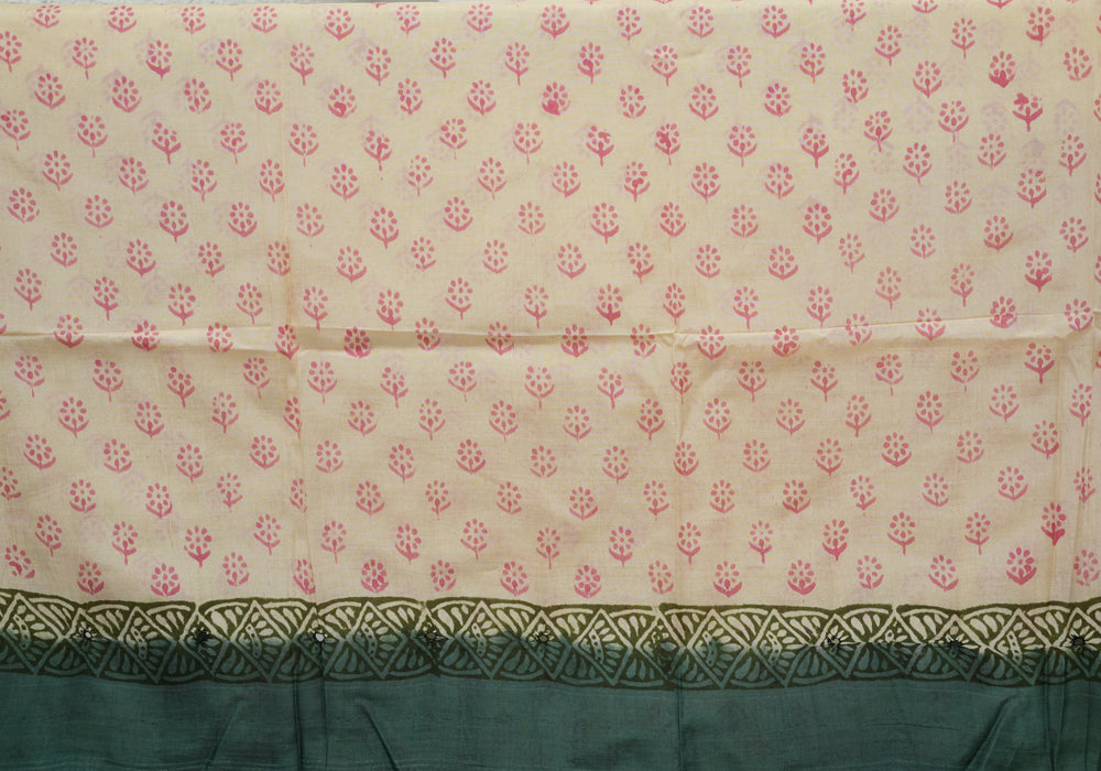 Teal Green and Beige Block Printed Chennur Silk Saree with Mirror Work