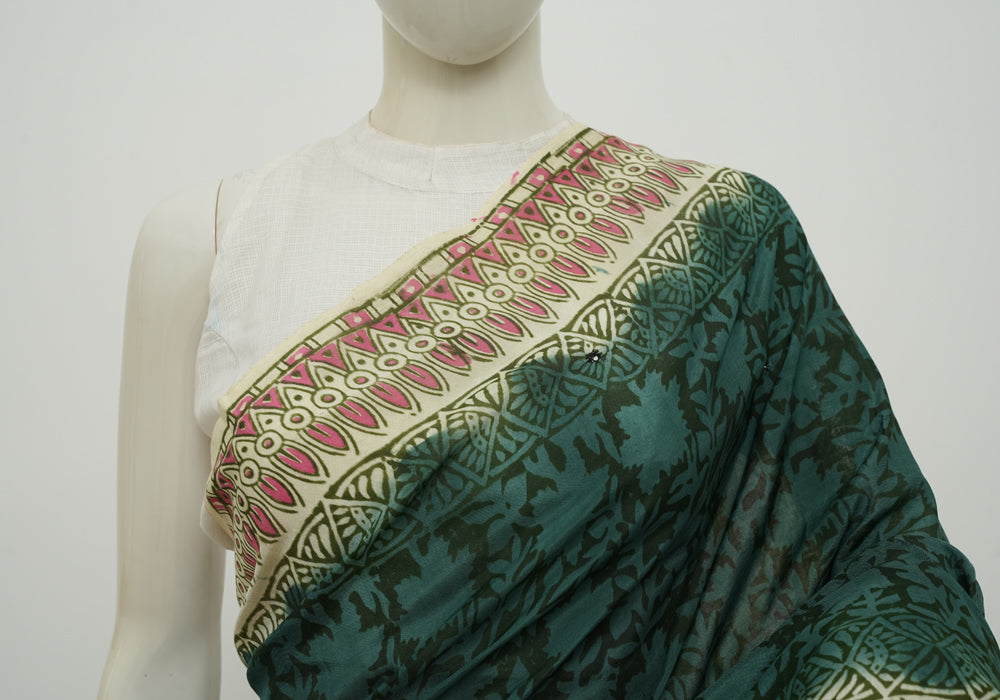 Teal Green and Beige Block Printed Chennur Silk Saree with Mirror Work is OUT OF STOCK currently and available on pre-payment only. Order now for delivery within 2 weeks.
