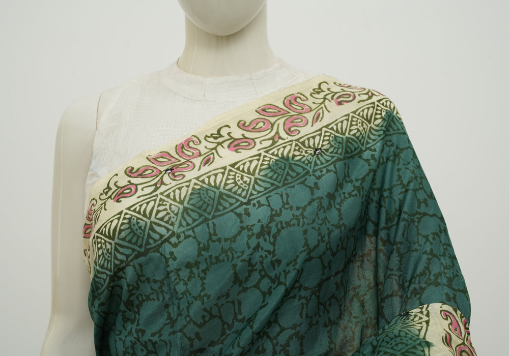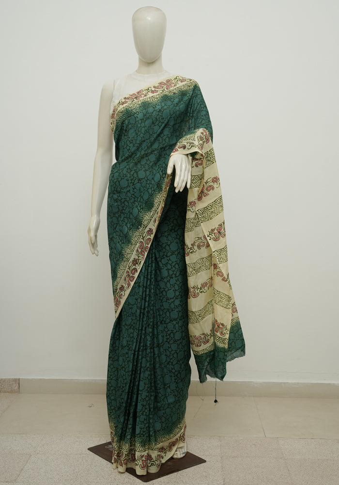 Teal Green and Beige Block Printed Chennur Silk Saree with Mirror Work