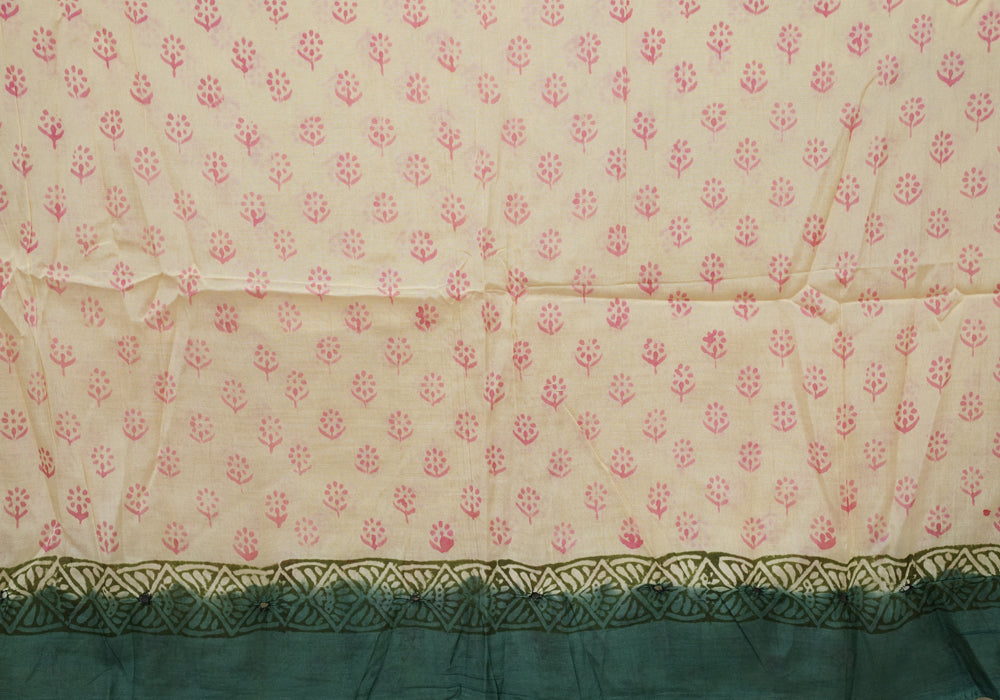 Teal Green and Beige Block Printed Chennur Silk Saree with Mirror Work is OUT OF STOCK currently and available on pre-payment only. Order now for delivery within 2 weeks.