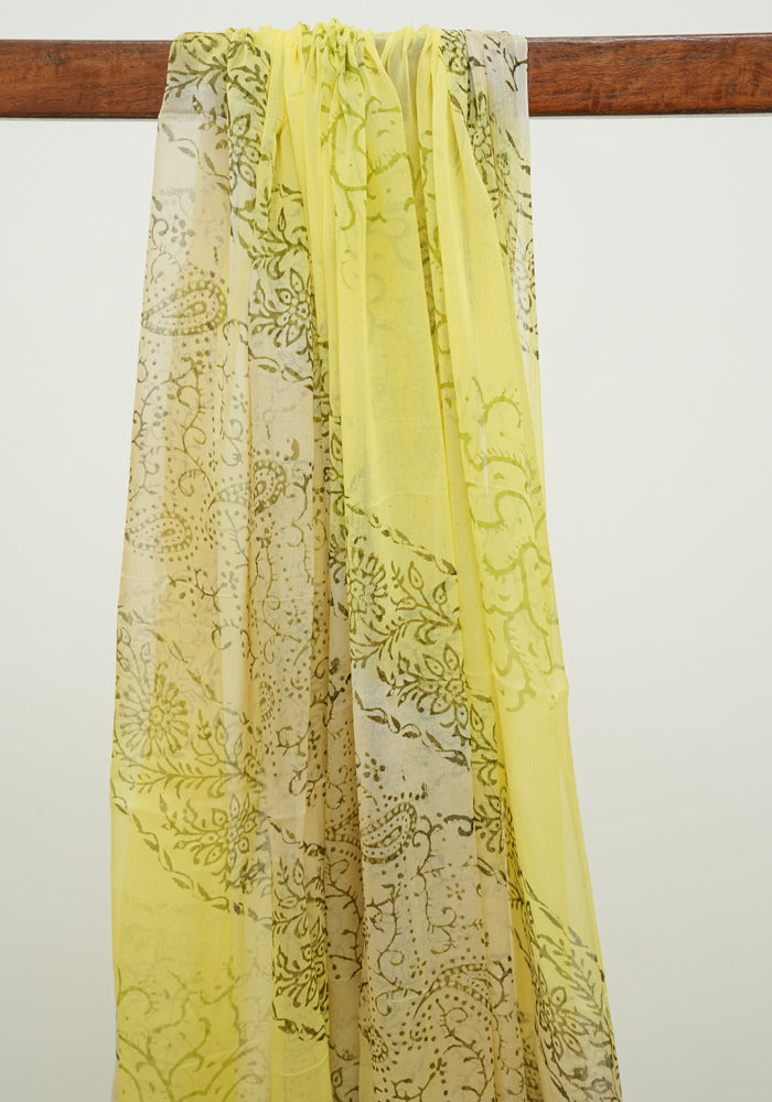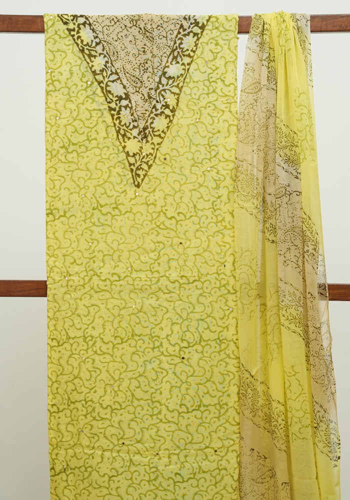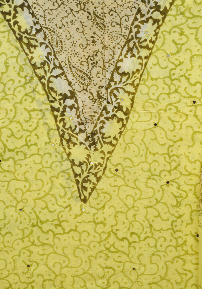 Lemon Yellow and Beige Unstitched Chennur Silk Salwar Set With Mirror Work is OUT OF STOCK currently and available on pre-payment only. Order now for delivery within 2 weeks.