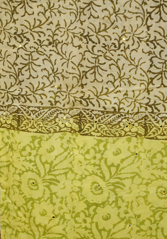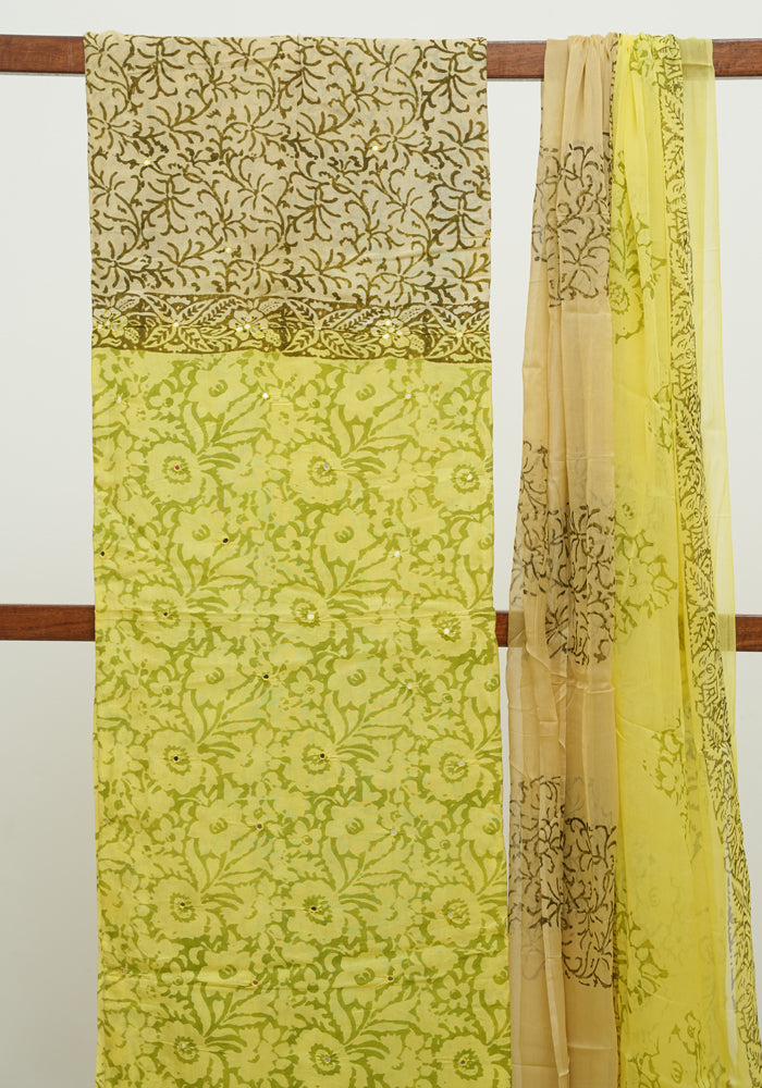 Lemon Yellow and Beige Unstitched Chennur Silk Salwar Set With Mirror Work is OUT OF STOCK currently and available on pre-payment only. Order now for delivery within 2 weeks.