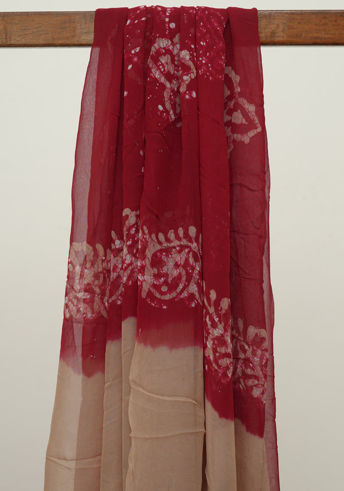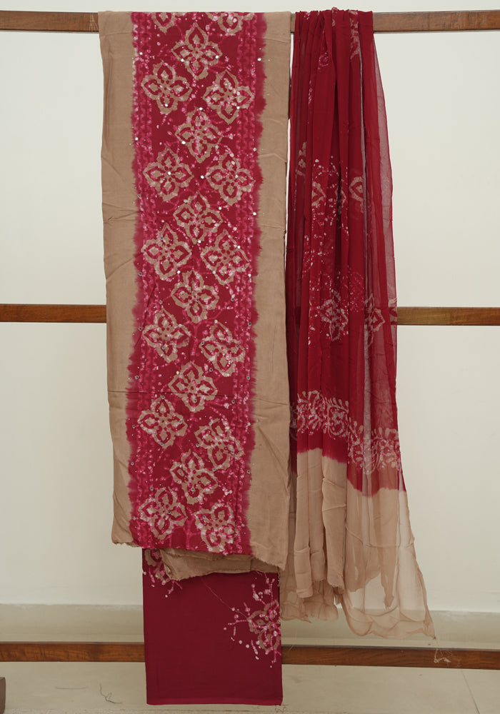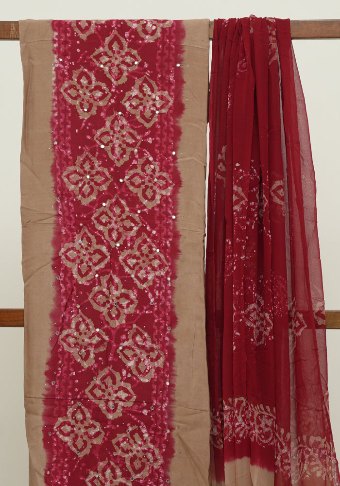 Light Brown and Red Batik Unstitched Muslin Chennur Silk Salwar Set With Mirror and Badla Work is OUT OF STOCK currently and available on pre-payment only. Order now for delivery within 2 weeks.