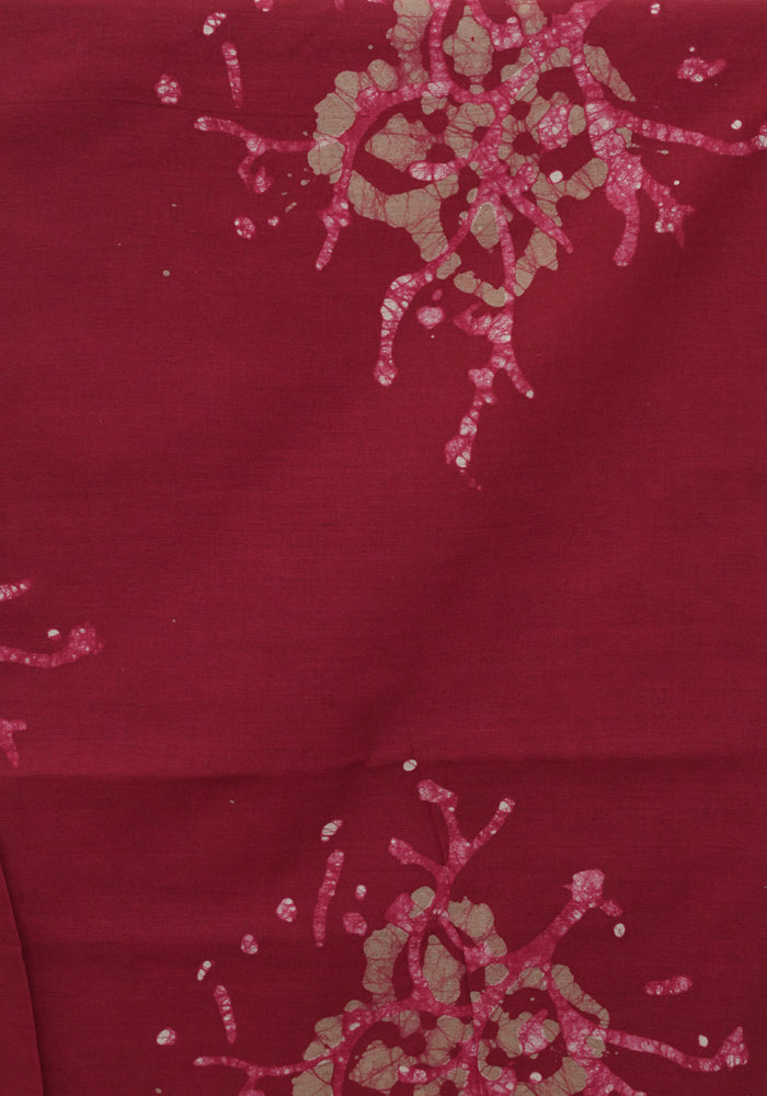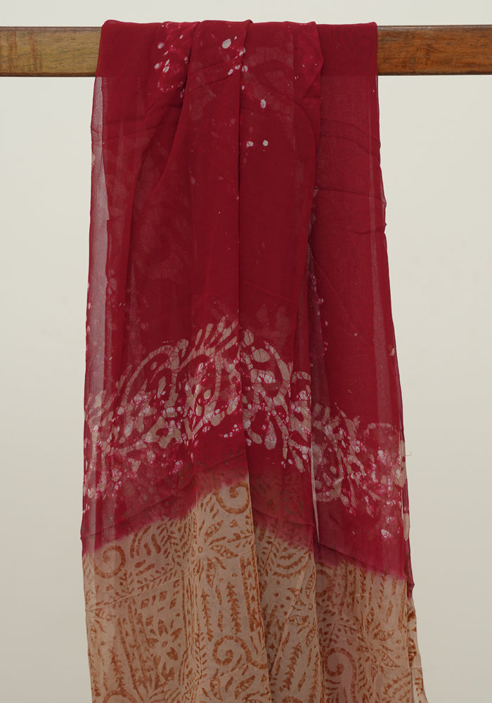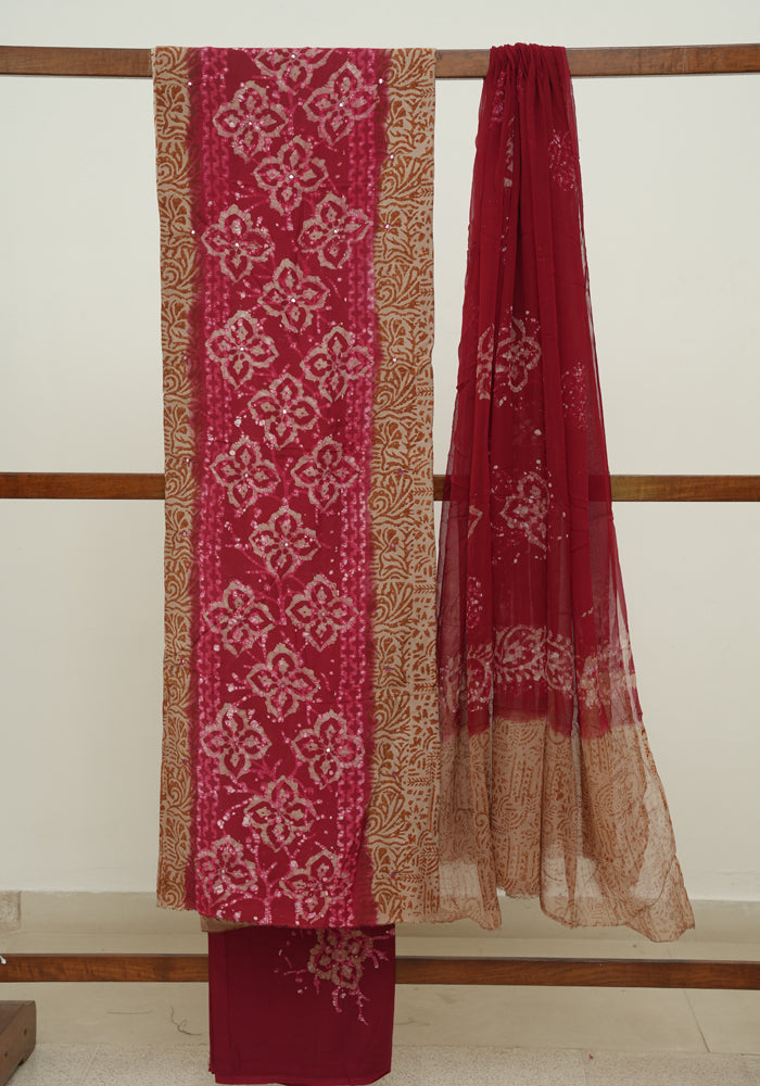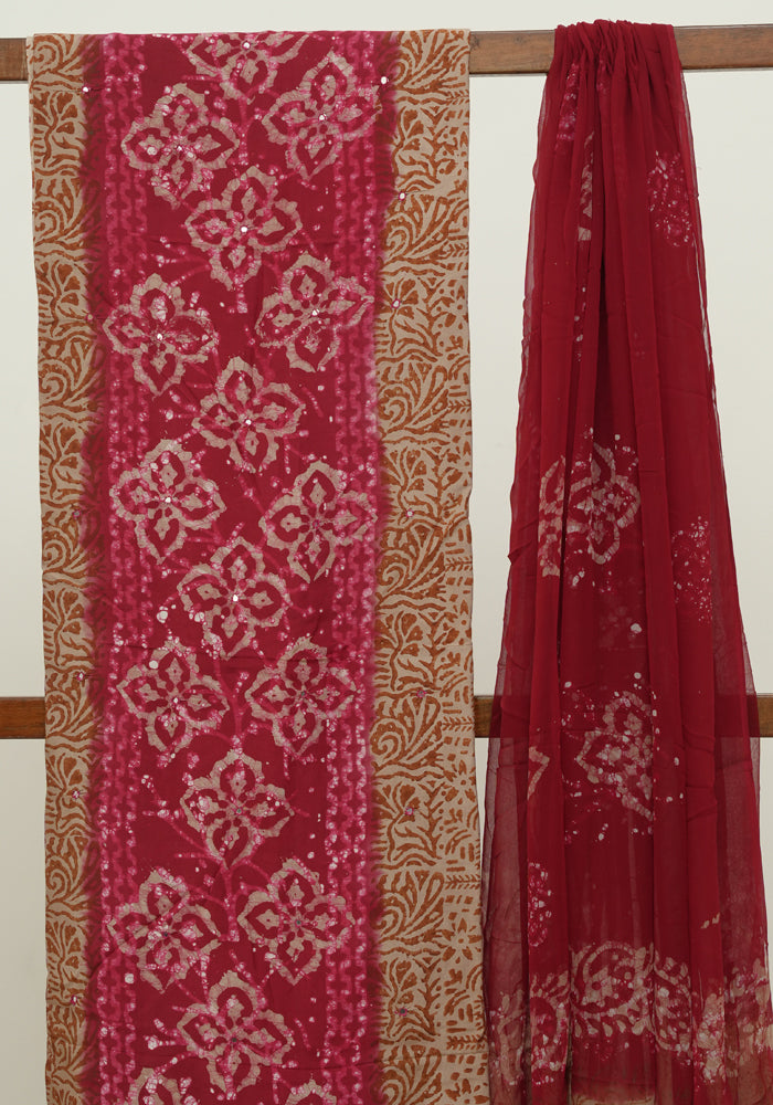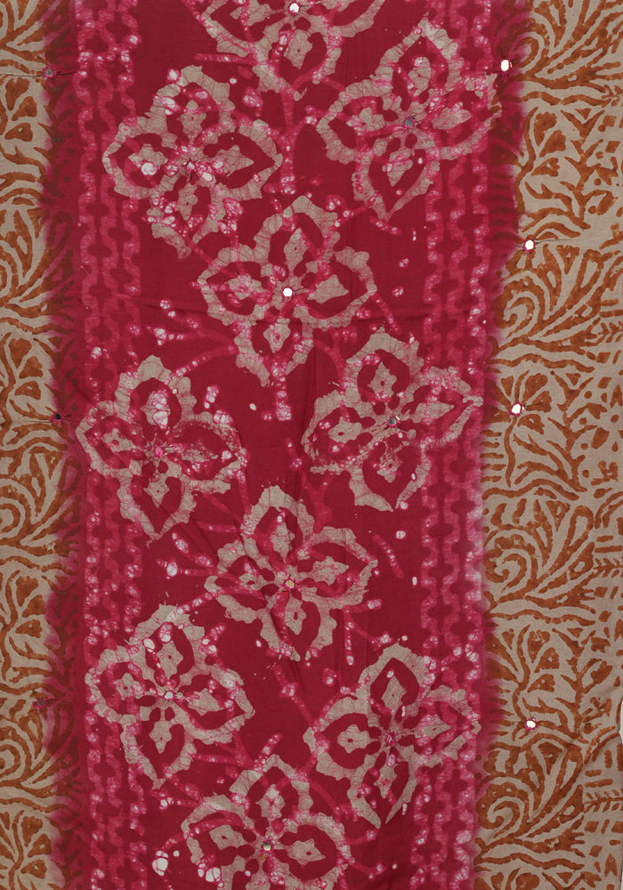 Light Brown and Red Batik Unstitched Muslin Chennur Silk Salwar Set With Mirror and Badla Work
