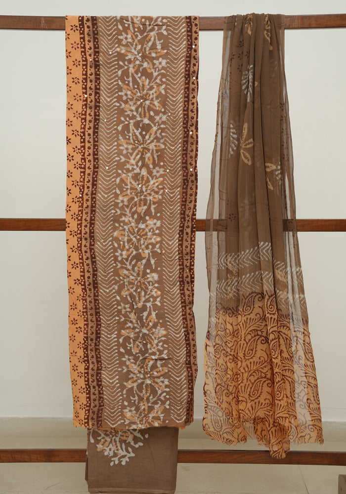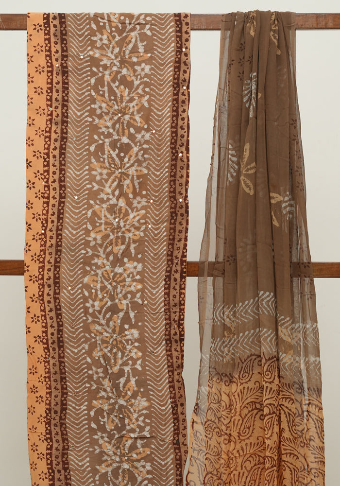 Light Orange and Brown Batik Unstitched Muslin Chennur Silk Salwar Set With Mirror and Badla Work