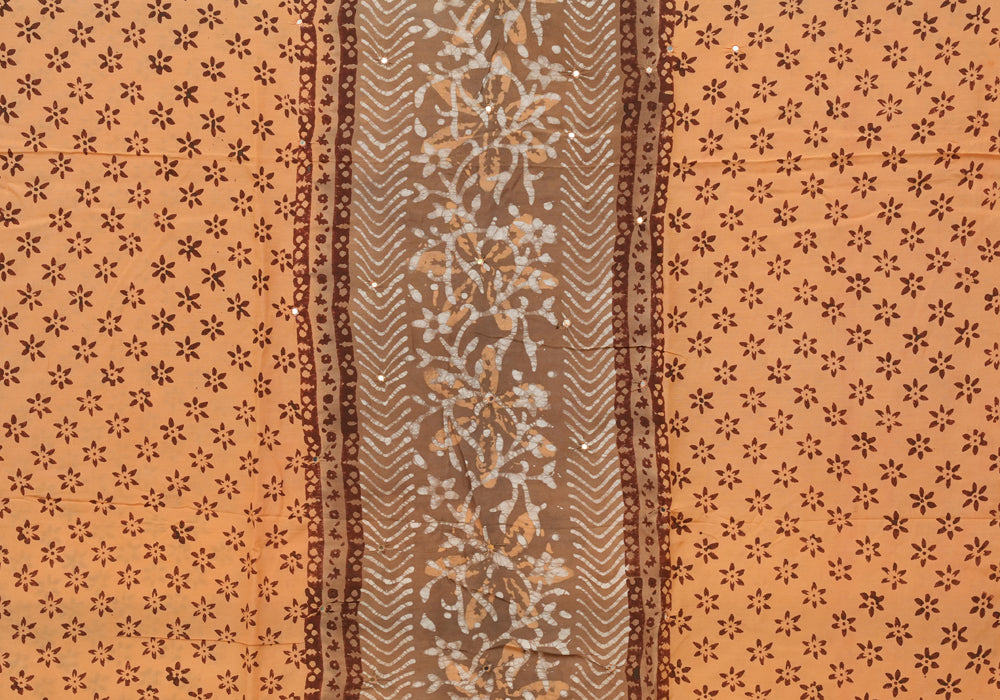 Light Orange and Brown Batik Unstitched Muslin Chennur Silk Salwar Set With Mirror and Badla Work is OUT OF STOCK currently and available on pre-payment only. Order now for delivery within 2 weeks.