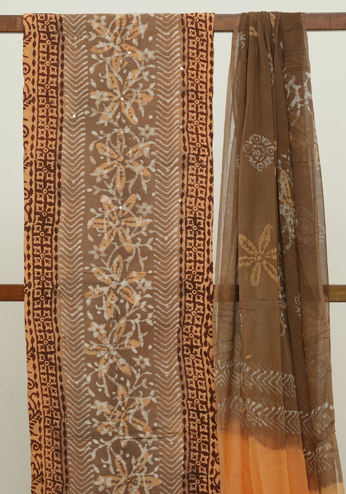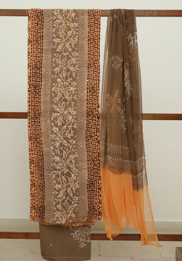 Light Orange and Brown Batik Unstitched Muslin Chennur Silk Salwar Set With Mirror and Badla Work