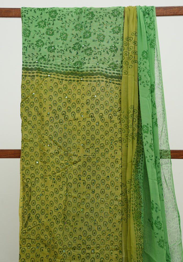 Mehandi Green and Parrot Green Unstitched Chennur Silk Salwar Set With Mirror Work