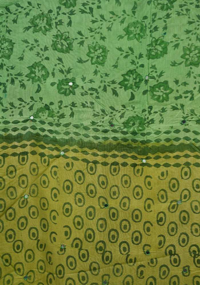 Mehandi Green and Parrot Green Unstitched Chennur Silk Salwar Set With Mirror Work is OUT OF STOCK currently and available on pre-payment only. Order now for delivery within 2 weeks.