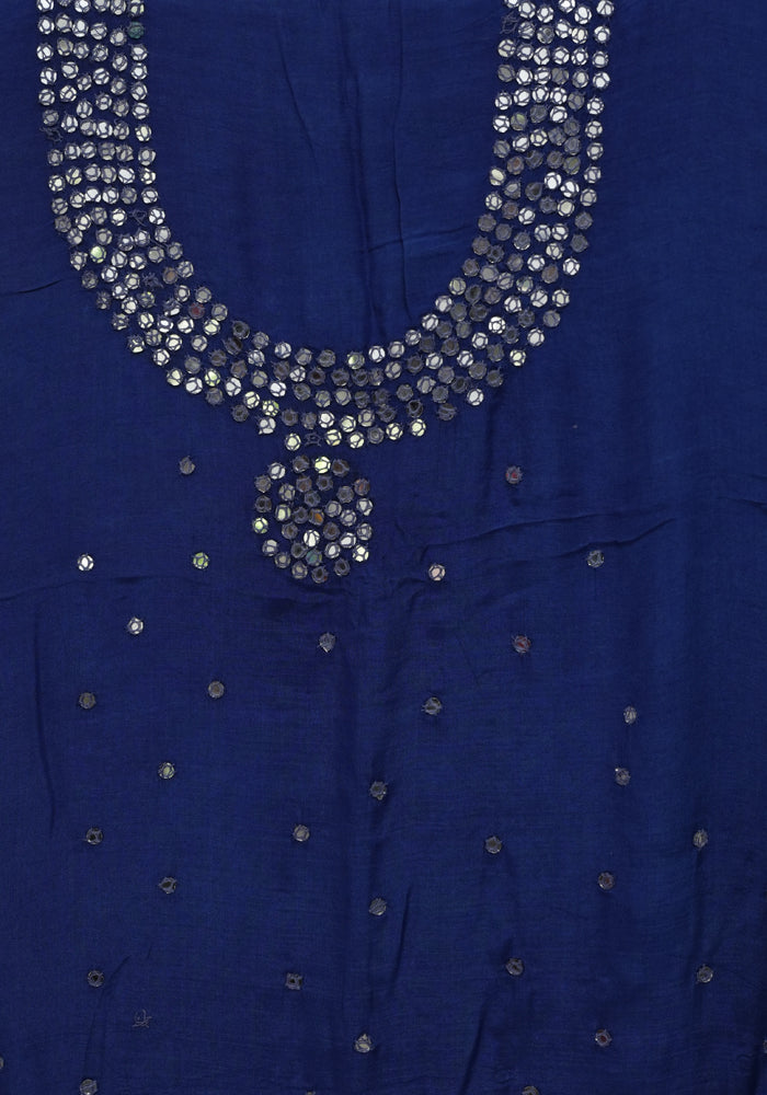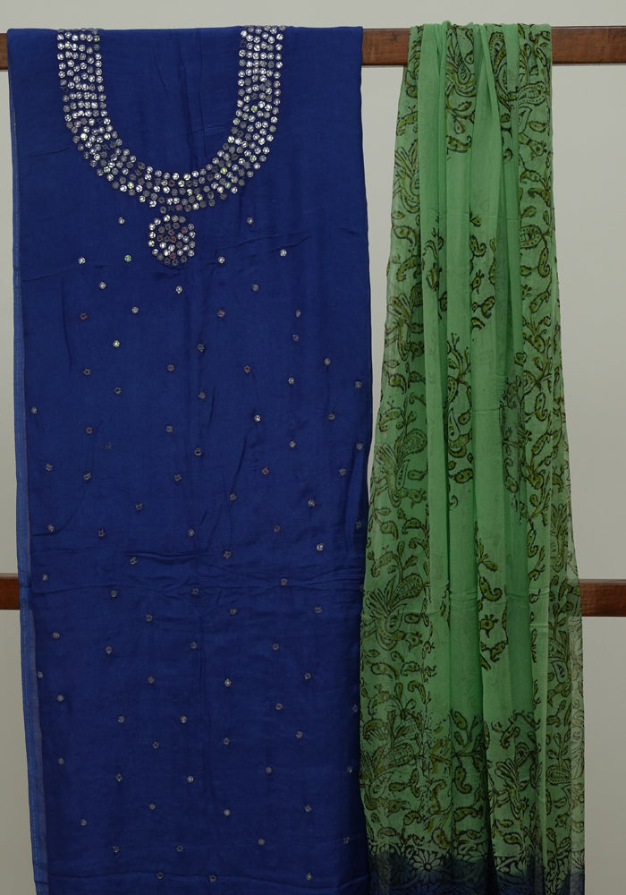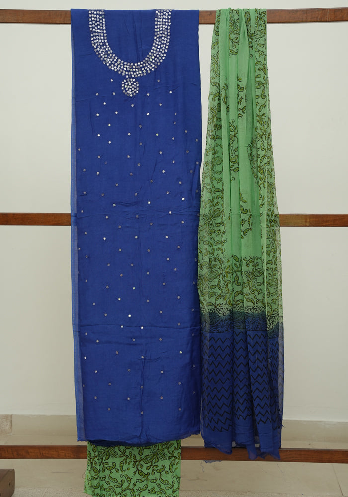 Navy Blue and Parrot Green Unstitched Muslin Chennur Silk Salwar Set With Rich Mirror Work