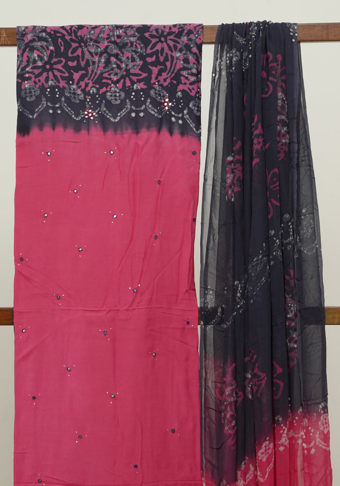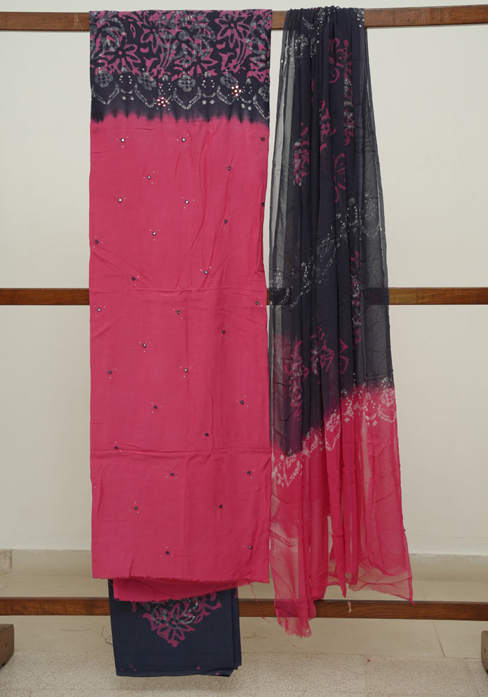 Pink and Navy Blue Batik Unstitched Muslin Chennur Silk Salwar Set With Mirror and Badla Work