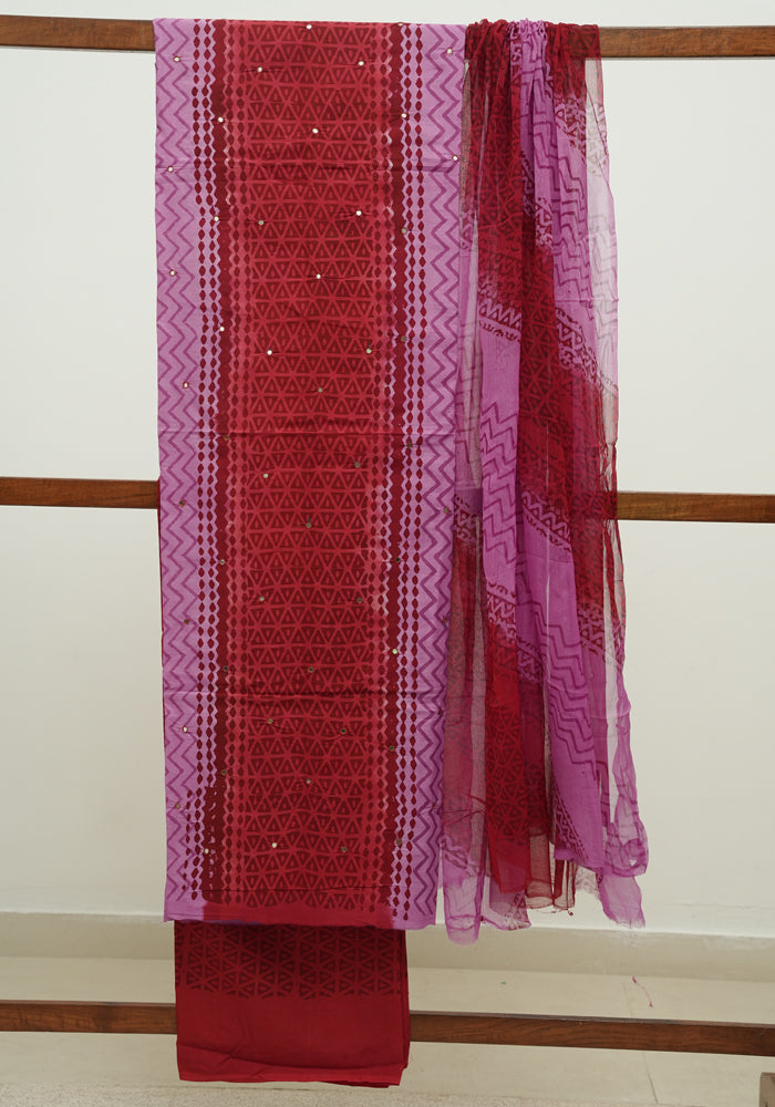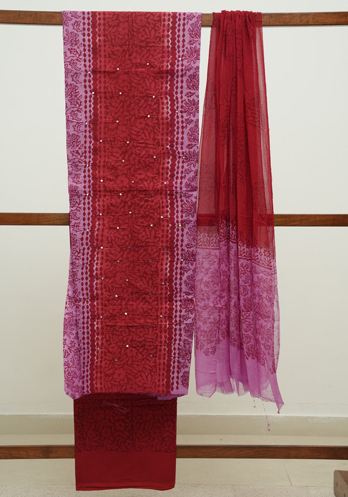 Purple and Red Unstitched Cotton Salwar Set With Mirror Work