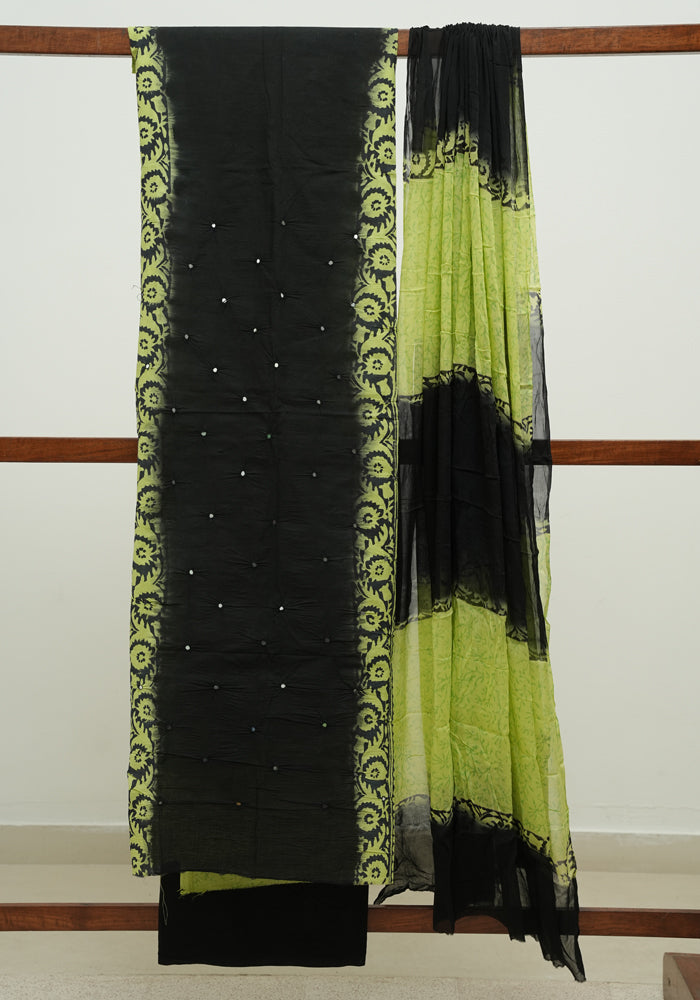 Light Green and Black Unstitched Cotton Salwar Set With Mirror Work
